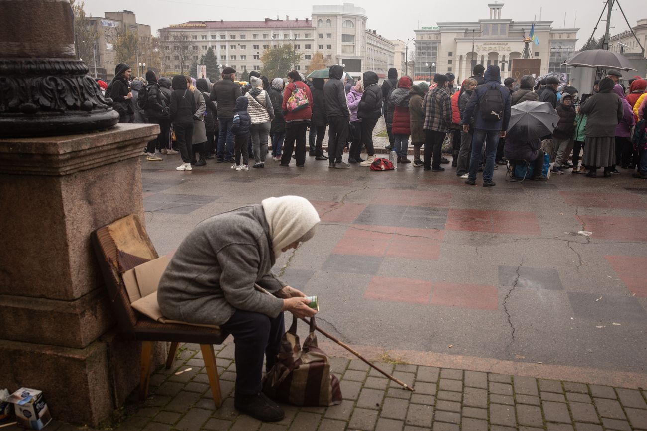 В Херсон и населенные пункты Херсонской области после их освобождения украинские власти начали доставлять гуманитарную помощь. Как сообщил сегодня замглавы офиса президента Украины Кирилл Тимошенко, только из Волынской области в регион прислали 17 тонн муки и более 8000 консерв, продуктовые наборы, средства личной гигиены, одежду для детей и взрослых, питьевую воду, а Закарпатье отправило 55 генераторов для жителей Херсонской области. На фото жители Херсона в одном из пунктов выдачи гуманитарной помощи 18 ноября.