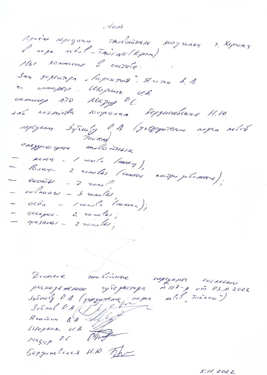 Я дозвонилась до Зубкова и спросила, сам он или по приказу сверху забрал животных. Он ответил, что дело было вообще по-другому. Ему позвонил военкор Михаил Андроник и сообщил, что в Херсоне есть зооуголок, и животные, оставшиеся там, могут погибнуть. «Я и не знал, что в Херсоне на острове Малый Потемкин есть зооуголок», — говорит Зубков. Остров, между прочим, в случае подрыва Новокаховской дамбы был бы затоплен, животные бы погибли.