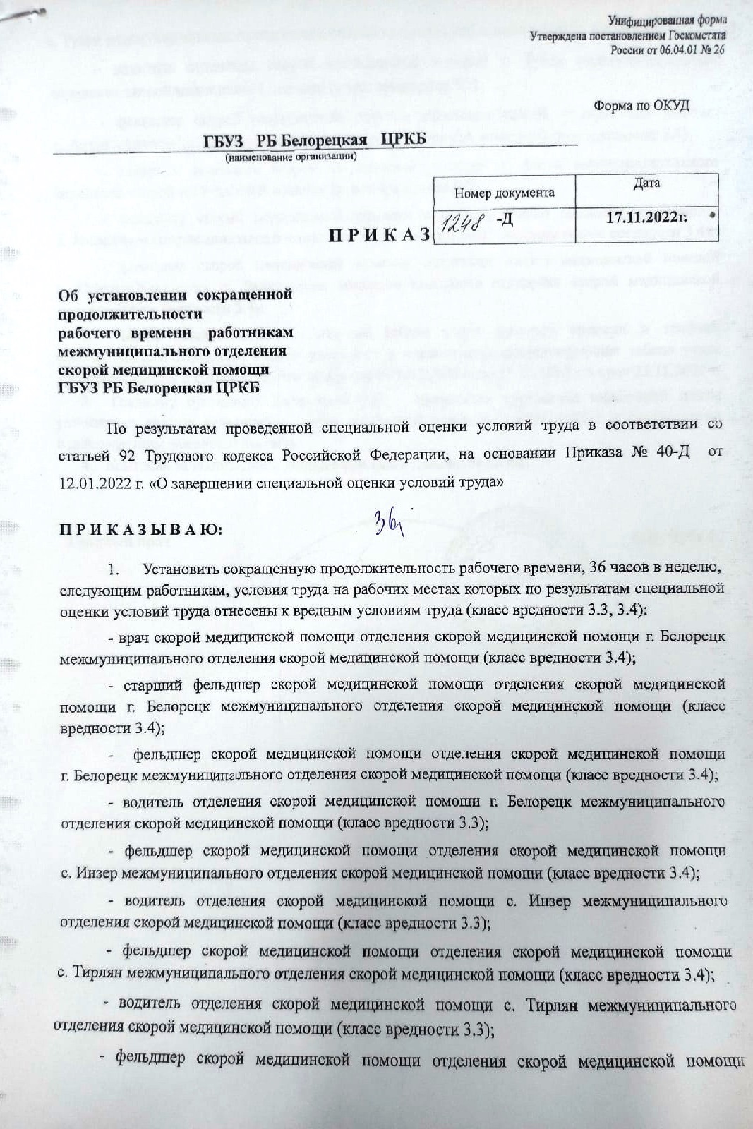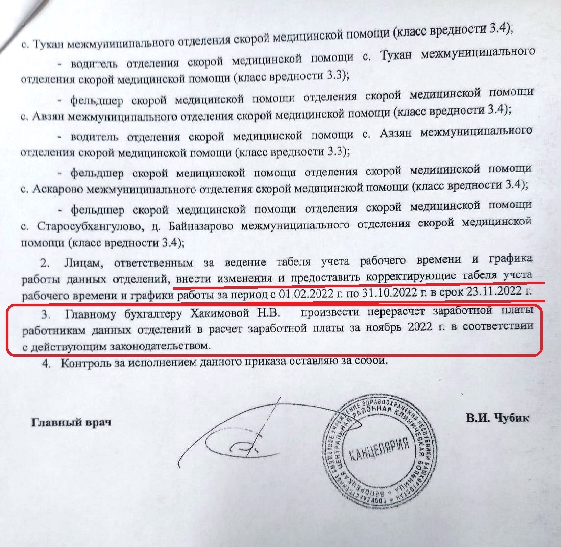 Как стало известно, главным врачом Белорецкой ЦРКБ Чубиком В. И. издан Приказ 1248-д, суть которого заключается в выплатах всем работникам отделений скорой помощи больницы за сверхурочную работу за период с февраля по октябрь 2022 года включительно по причине несвоевременного заключения с работниками соответствующих соглашений об изменении итогового класса вредности с 3.2 на 3.4. Все это стало возможным благодаря активным действиям профсоюза "Действие", который не на словах, а на деле отстаивает трудовые права медицинских работников. Так, от имени профсоюза в адрес главного врача было направлено требование об устранении нарушений, после которого работодателю деваться уже было некуда.