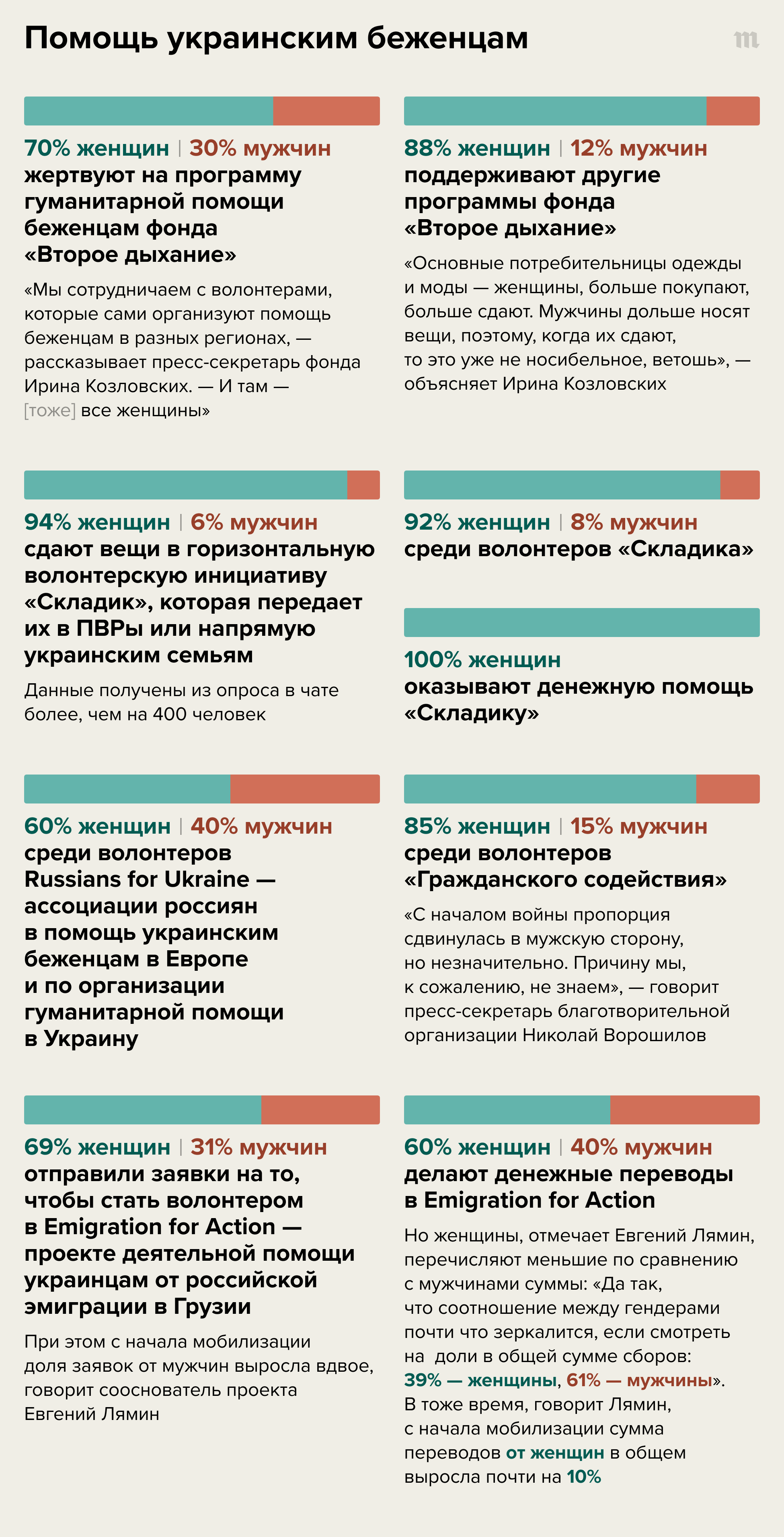 Однако женщины в России активнее мужчин участвуют и в других проектах, помогающих украинским беженцам. Помогали они больше и до войны, отмечают поговорившие с «Медузой» благотворители. Почему так происходит, есть только предположения.