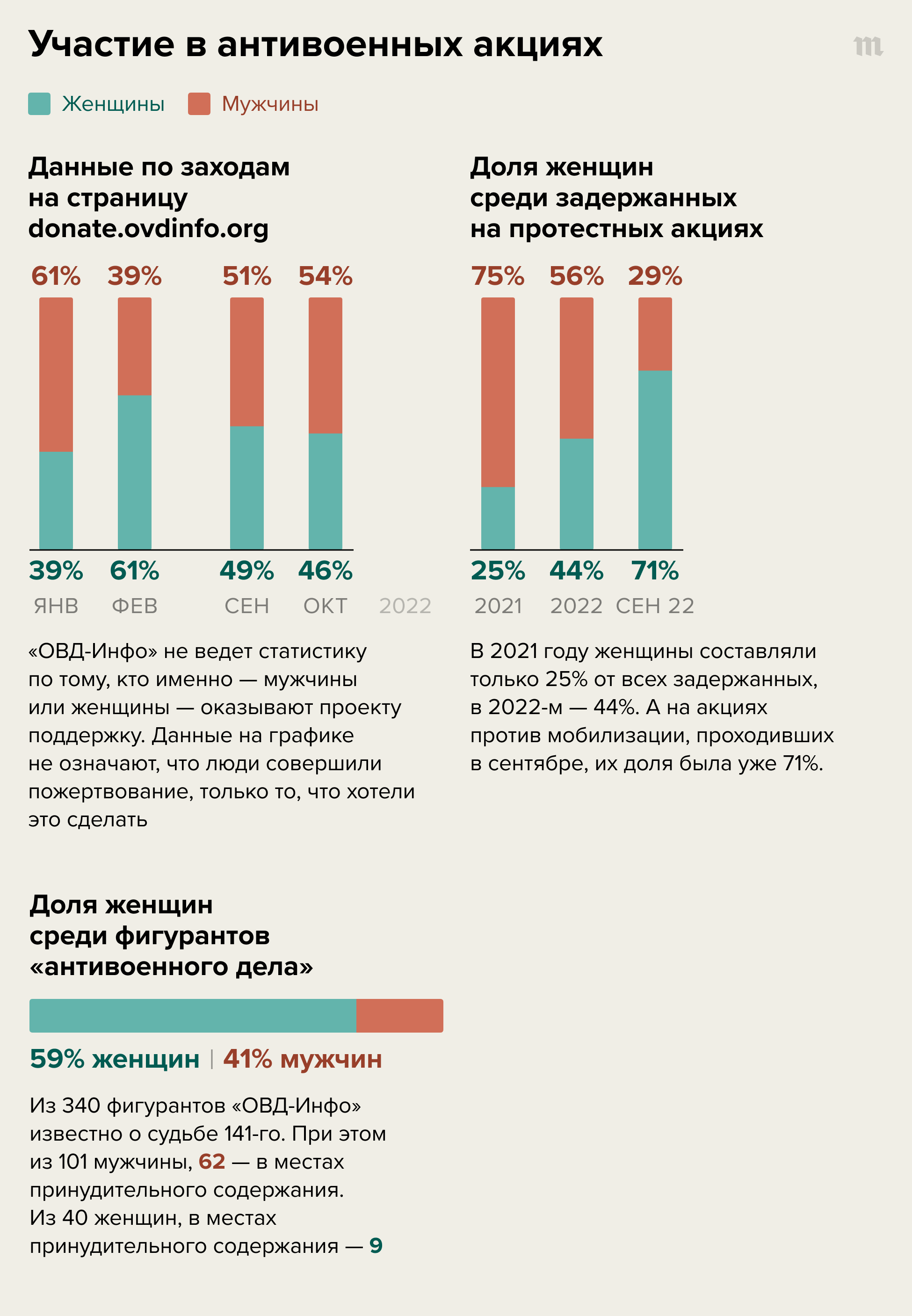 «Женщин значительно реже, чем мужчин, задерживают на акциях, сопровождающихся массовыми задержаниями», — говорится в докладе «ОВД-Инфо», анализирующем нарушения права на свободу собраний с 2010 по июнь 2020 года. При этом, согласно свежей статистике проекта, в 2022-м случаи задержания женщин участились. Если в 2021 году женщины составляли только 25% от всех задержанных, то в 2022-м — 44%. А на акциях против мобилизации, проходивших 24 сентября, их доля была уже 71%.