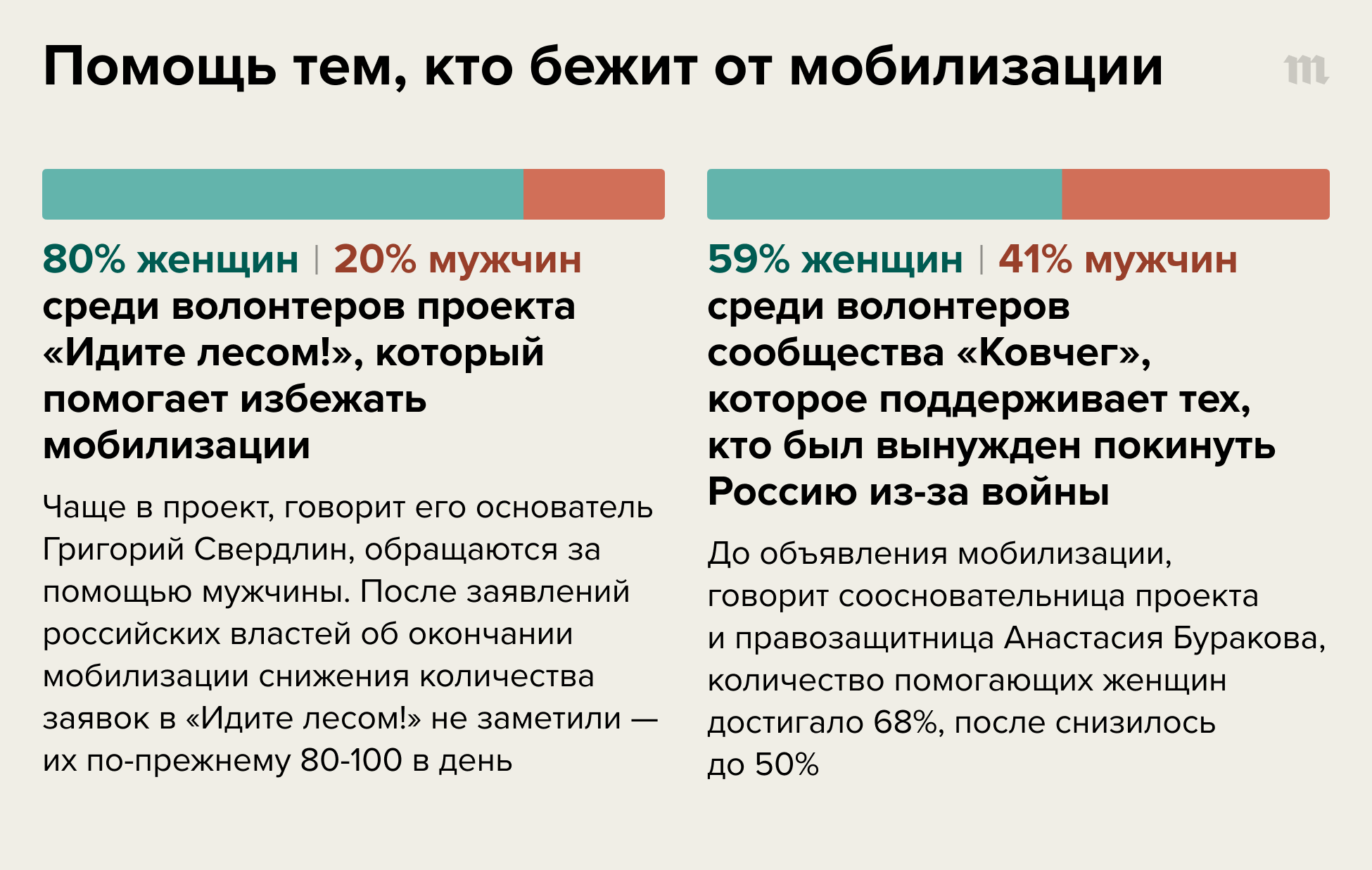 В последнее время за помощью к ним обращаются реже, но спад Марина заметила еще до того, как Минобороны РФ в конце октября объявило о прекращении выдачи повесток по мобилизации (хотя указ о ее окончании Путин так и не подписал). «Первый шок прошел. Люди выбрали для себя какие-то стратегии — и стали потихоньку уже самостоятельно по ним двигаться», — комментирует Марина.