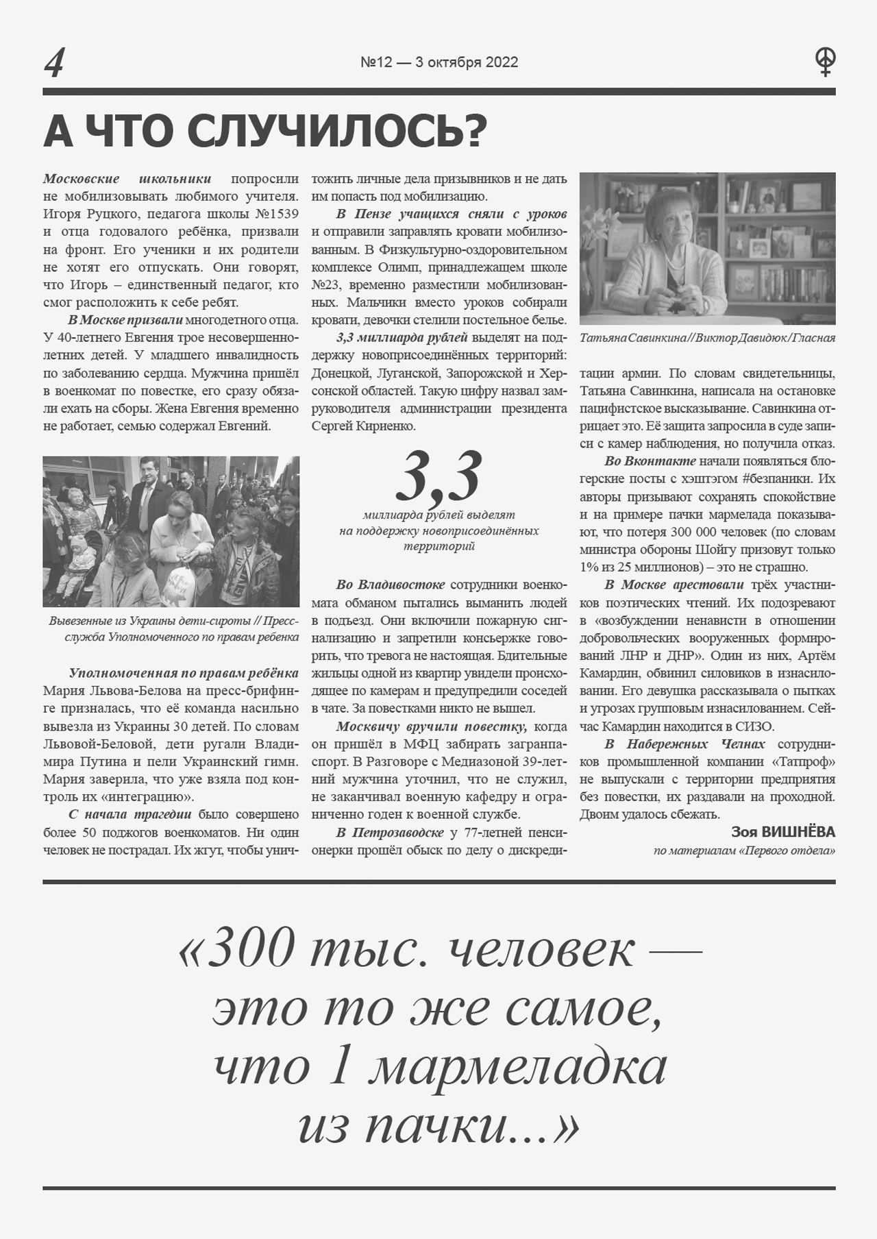 «Я вообще с тех пор, как занялась газетой, стараюсь быть потише, — говорит фемактивистка. — В подъездах есть камеры, они везде есть. Если меня вычислят, во-первых, я не смогу делать свою работу. Во-вторых, риски для моих коллег [по антивоенному движению]».