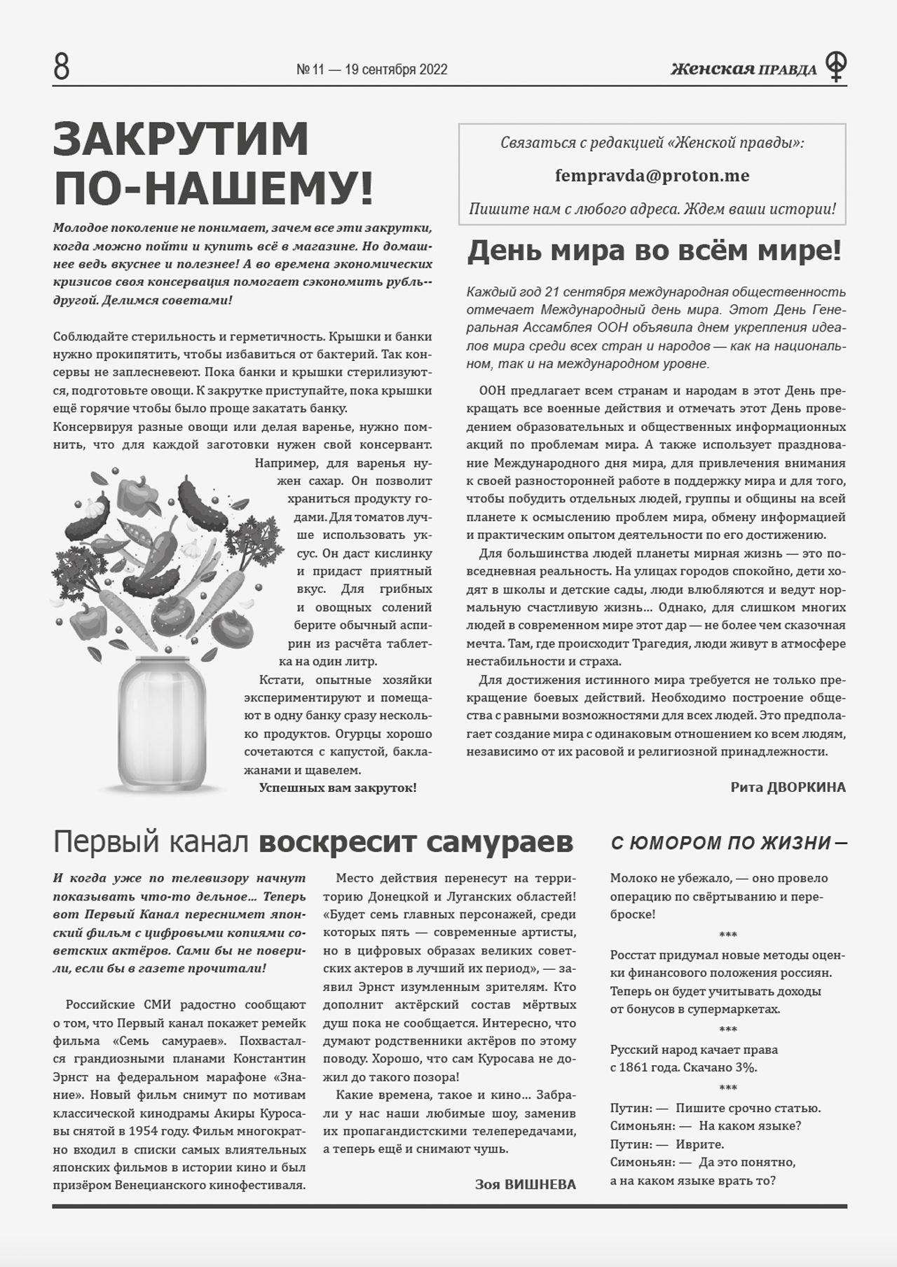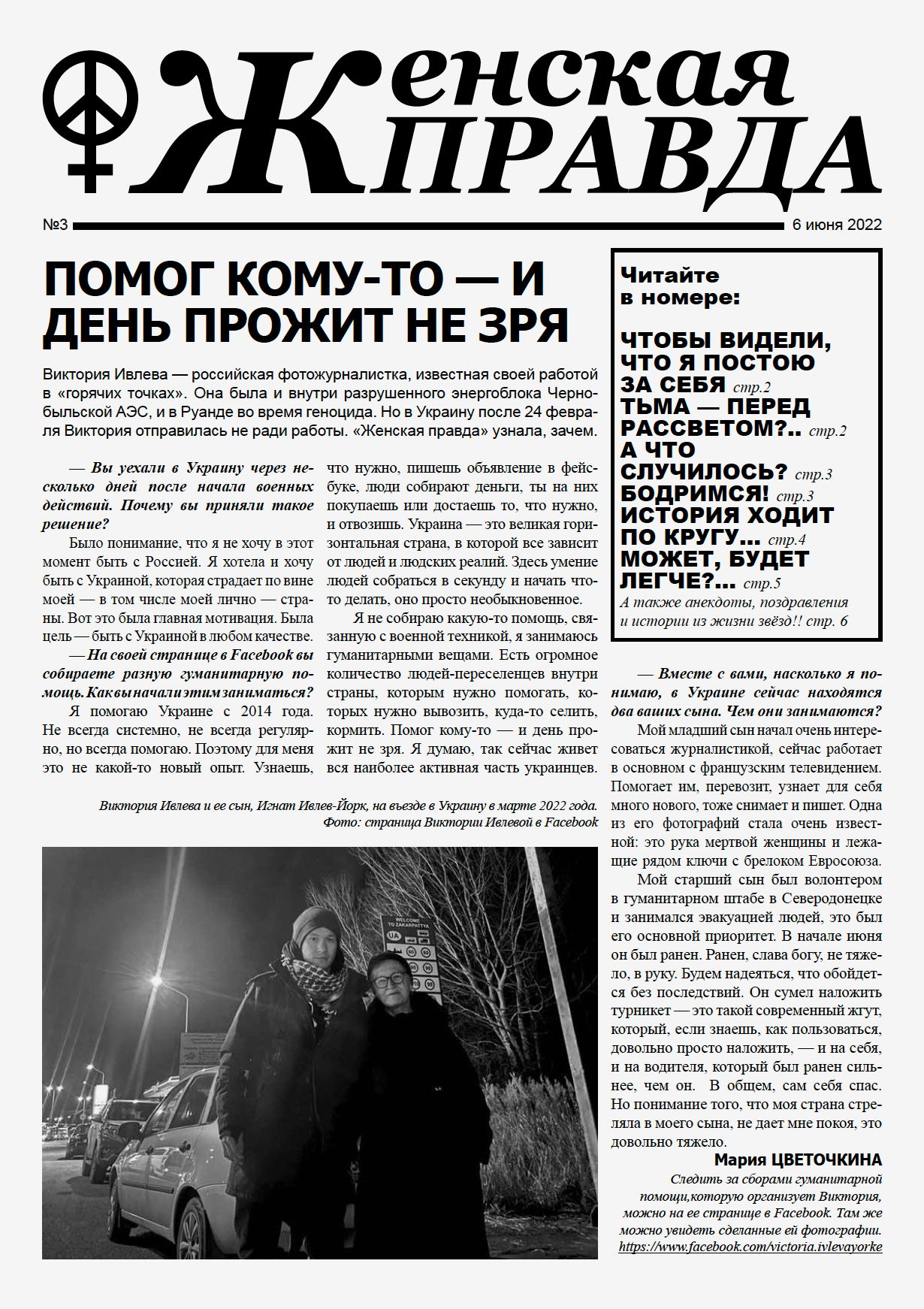 Анжелика присоединилась к работе над газетой в июне, перед выходом третьего номера (первый был посвящен 9 Мая). «Я поняла, что это то, чем я могла бы помогать, — говорит она. — С детства у меня хорошо с текстами. Я работала в глянцевых журналах, писала про поп-культуру и женскую повестку. Плюс мне было интересно, что „Женская правда“ рассчитана на аудиторию моей мамы — взрослые женщины таких [провластных] взглядов. Это аудитория, к которой никто [из независимых СМИ] не обращается, при этом очень важно к ней обратиться».