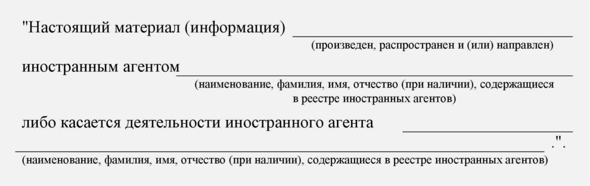 В частности, меняется плашка для указания «иноагента». Теперь вместо «данного сообщения» надо будет писать «настоящий материал».