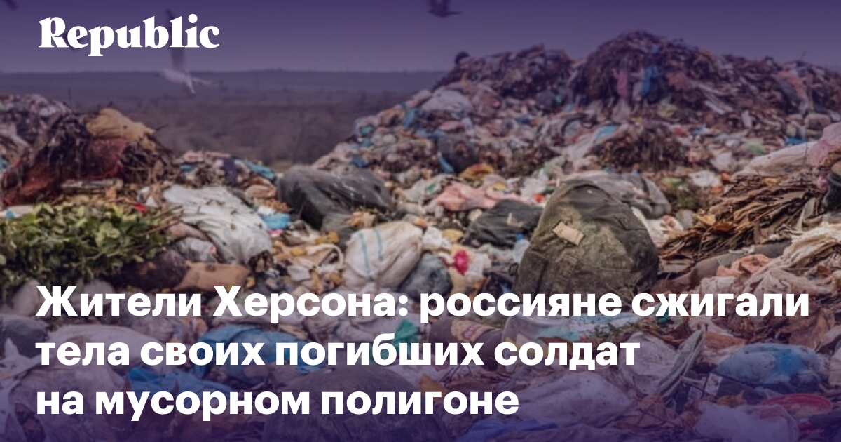 Во время оккупации Херсона российские военные могли использовать мусорный полигон на окраине города для сжигания трупов своих погибших солдат. Об этом местные жители рассказали британской газете The Guardian. С их слов, ВС РФ летом сделали территорию свалки запретной зоной, ограничив въезд на нее гражданских. С этого времени на полигоне нередко замечали грузовики с черными мешками, которые выбрасывали и затем поджигали, из-за чего воздух наполнялся густым едким дымом и запахом горящей плоти.