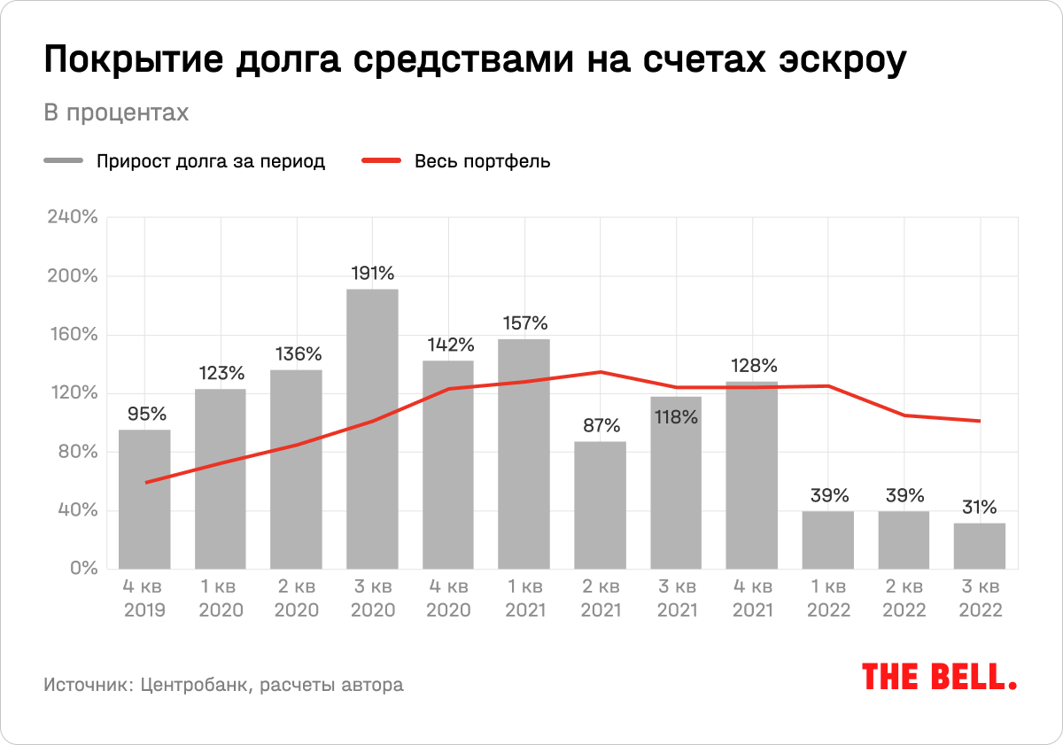 Лучше всего ситуацию с проектным финансированием показывает график с покрытием долга средствами на счетах эскроу. Как видно из уровней покрытия, выданные кредиты были с запасом покрыты эскроу, но с начала «спецоперации» ситуация резко изменилась: рост долгового портфеля опережает рост портфеля эскроу в 3–4 раза последние четыре месяца.