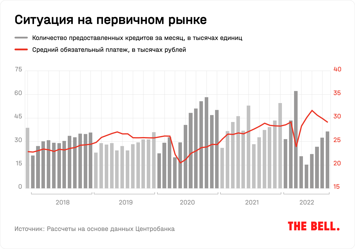 Застройщики и банки, чтобы компенсировать этот разрыв, стали активно выдавать «ипотеки под 0,1%», из-за чего средняя ставка упала ниже 4%, и увеличивать сроки предоставления кредита. Например, до пандемии займы выдавались примерно на 19 лет (указан срок погашения при выдаче для расчета платежа, в реальности ипотечный кредит погашается примерно за 7 лет), а сейчас — более чем на 25. Это позволяет поддерживать комфортный ипотечный платеж при падающих реальных доходах населения и как минимум не снижать цены в условиях падения спроса. В чистом виде это накачивание отрасли дешевыми деньгами — без ипотеки квартиру в новостройке комфорт-класса в Москве сейчас купить практически невозможно. Некоторые застройщики уже говорят о том, что доля продаж в ипотеку в третьем квартале 2022-го превысила 90%, хотя раньше держалась ближе к 70%.