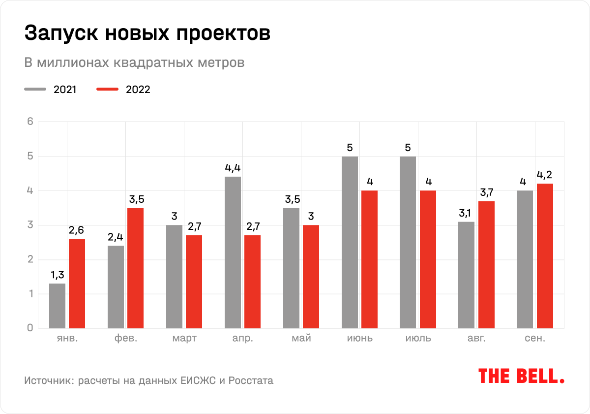 Вооружившись поговоркой «нет ничего более постоянного, чем временное», застройщики решили, что низкие ставки в экономике и льготная ипотека будут длиться вечно, поэтому еще в 2020–2021 годах запустили в работу большое количество проектов. На то, чтобы получить разрешение на строительство, в среднем уходит больше года. Поэтому эти проекты начали выходить на рынок только в 2022 году. В результате за 9 месяцев разрешение на строительство получили более 30 млн кв. м новых проектов. Это всего на 4% меньше, чем в 2021 году, когда рынок испытывал эйфорию (см. график).