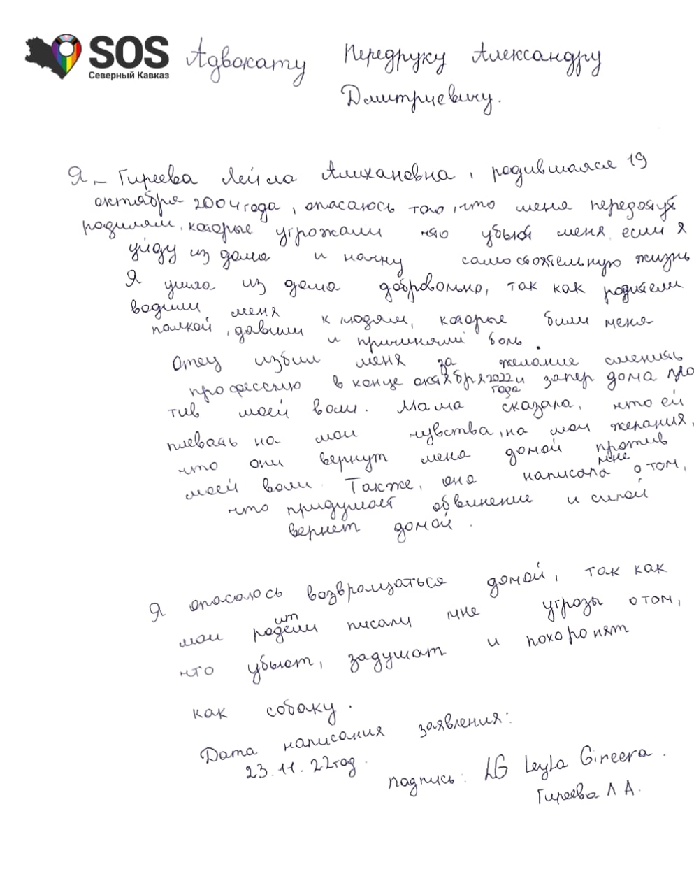 – Я добровольно ушла из дома, потому мои родители хотели изменить меня, заставить меня отказаться от моих ценностей, лечили меня психиатрами, пичкали таблетками, били и угрожали убить. Прошу не выдавать меня моим родственникам, – говорила Лейла Гиреева в первом публичном видеообращении после побега.
