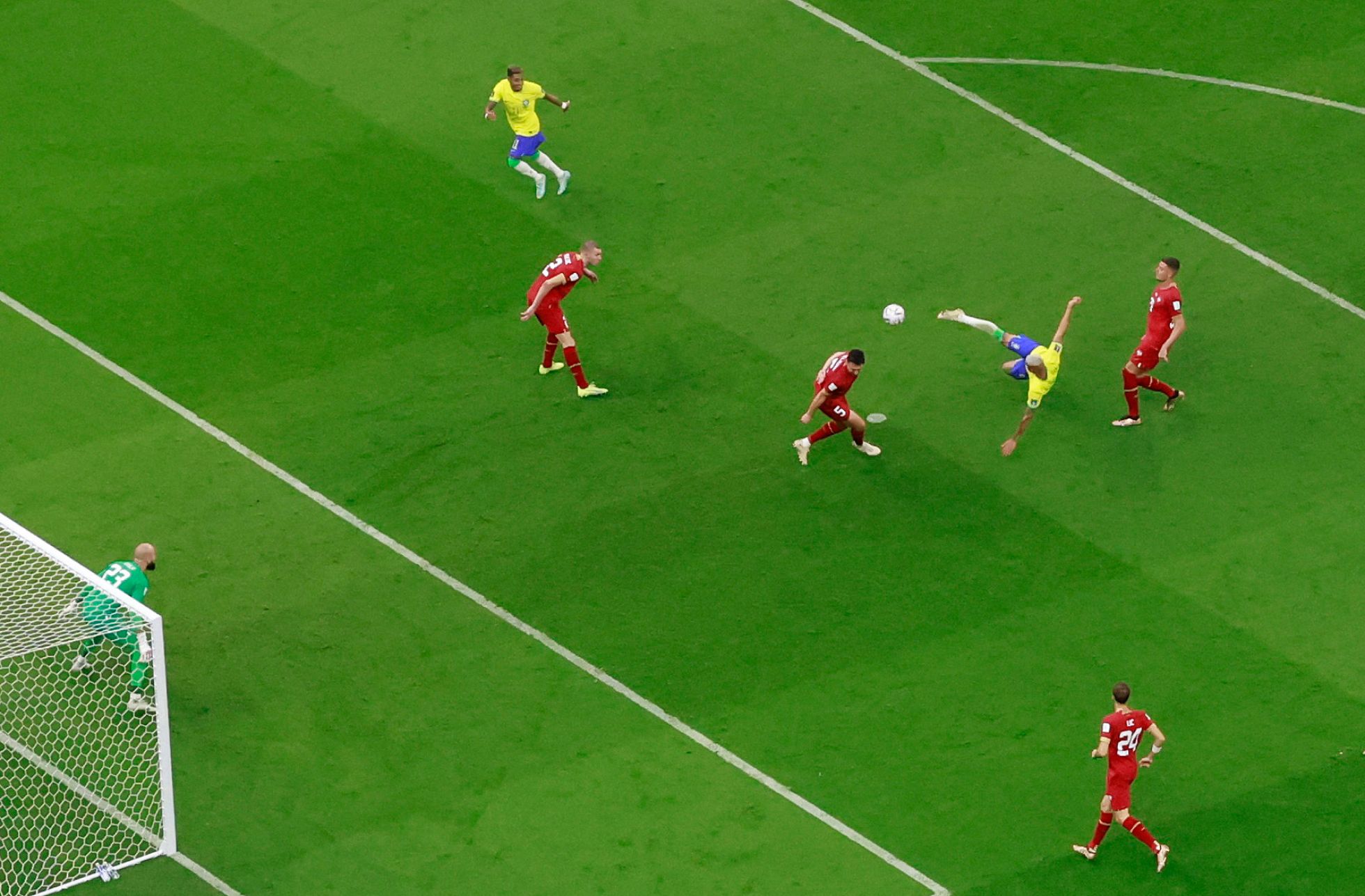 Peter Cziborra / Reuters / Scanpix / LETA В первом для сборной Бразилии матче чемпионата мира по футболу в Катаре нападающий Ришарлисон не только дважды забил сербам, но и стал автором самого, пока что, красивого гола этого турнира. Приняв пас от Винисиуса Жуниора, Ришарлисон подкинул мяч над головой и отправил в ворота ударом через себя. Бразильцы благодаря дублю Ришарлисона обыграли сборную Сербии 2:0 и вышли на первое место в своей группе. 24 ноября 2022 года