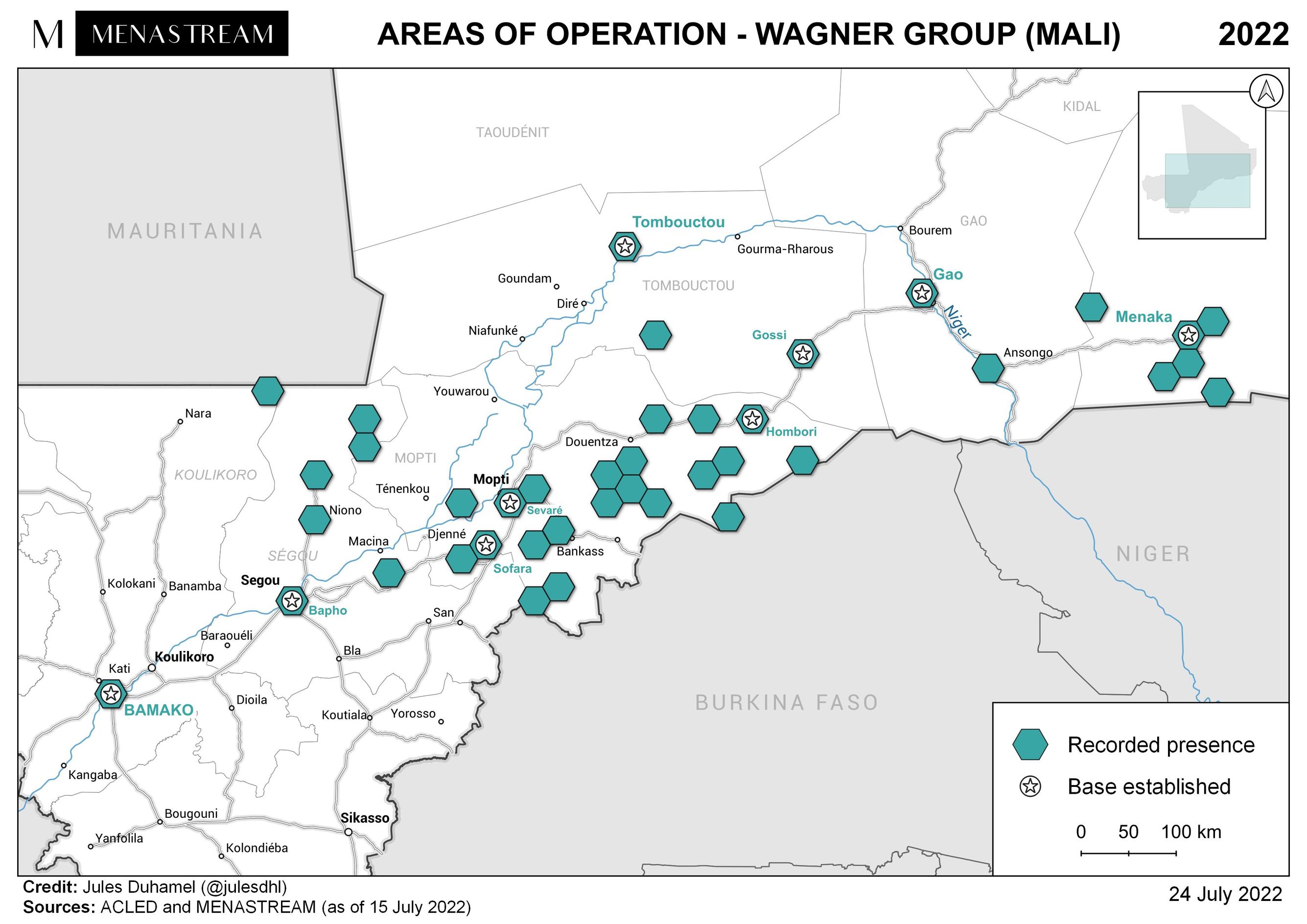 The presence of Russian mercenaries in Mali expanded over the course of the year. Data analysis projects ACLED and Menastream show that by mid-July, there were nine PMC bases in the country, and operations involving Russian mercenaries were conducted in over 32 locations in central and northeastern Mali. In June, The New York Times reported that there were more than 1,000 Russian mercenaries deployed at roughly 15 bases and checkpoints across Mali.