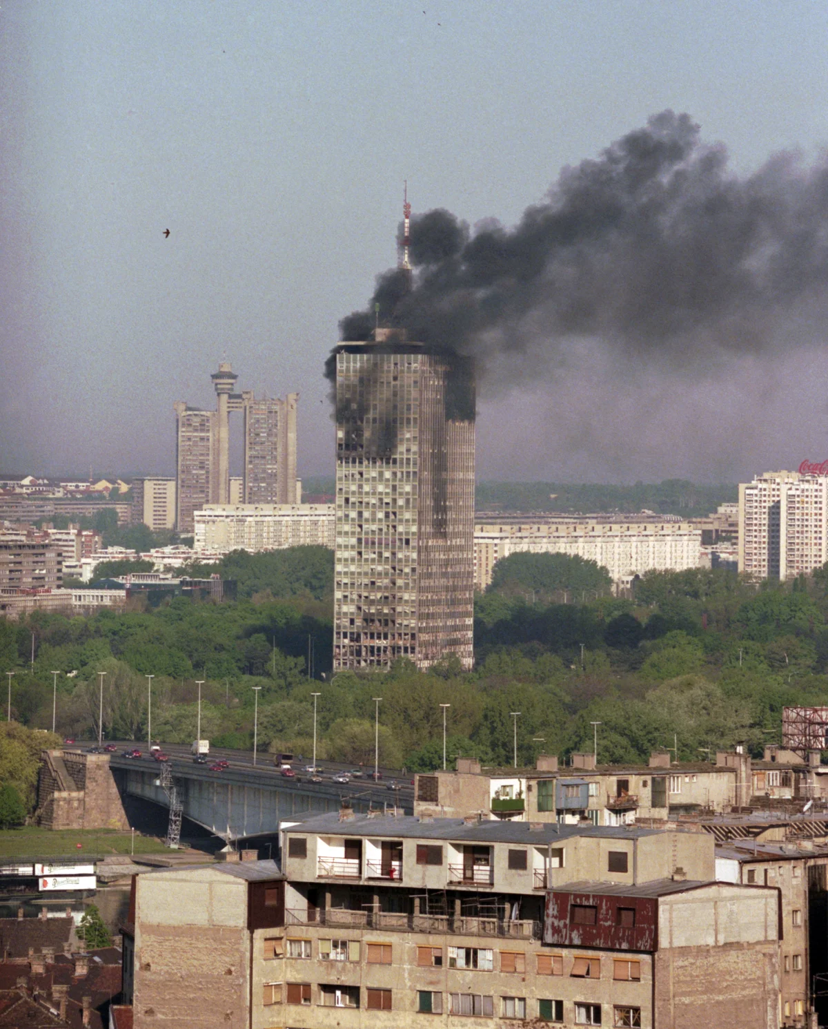21 апреля 1999 года. Пожар в штаб-квартире Социалистической партии Сербии после авианалета НАТО. Фото: Сергей Величкин, Александр Данилюшин / Фотохроника ТАСС