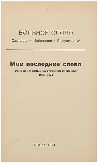 Книжица называется «Мое последнее слово. Речи подсудимых на судебных процессах 1966–1974 гг.». Тогда (в 1974-м) ее можно было ввезти в СССР только нелегально, если задержат — будь готов сам срок «схватить». Сегодня книжицу вроде бы можно читать открыто.