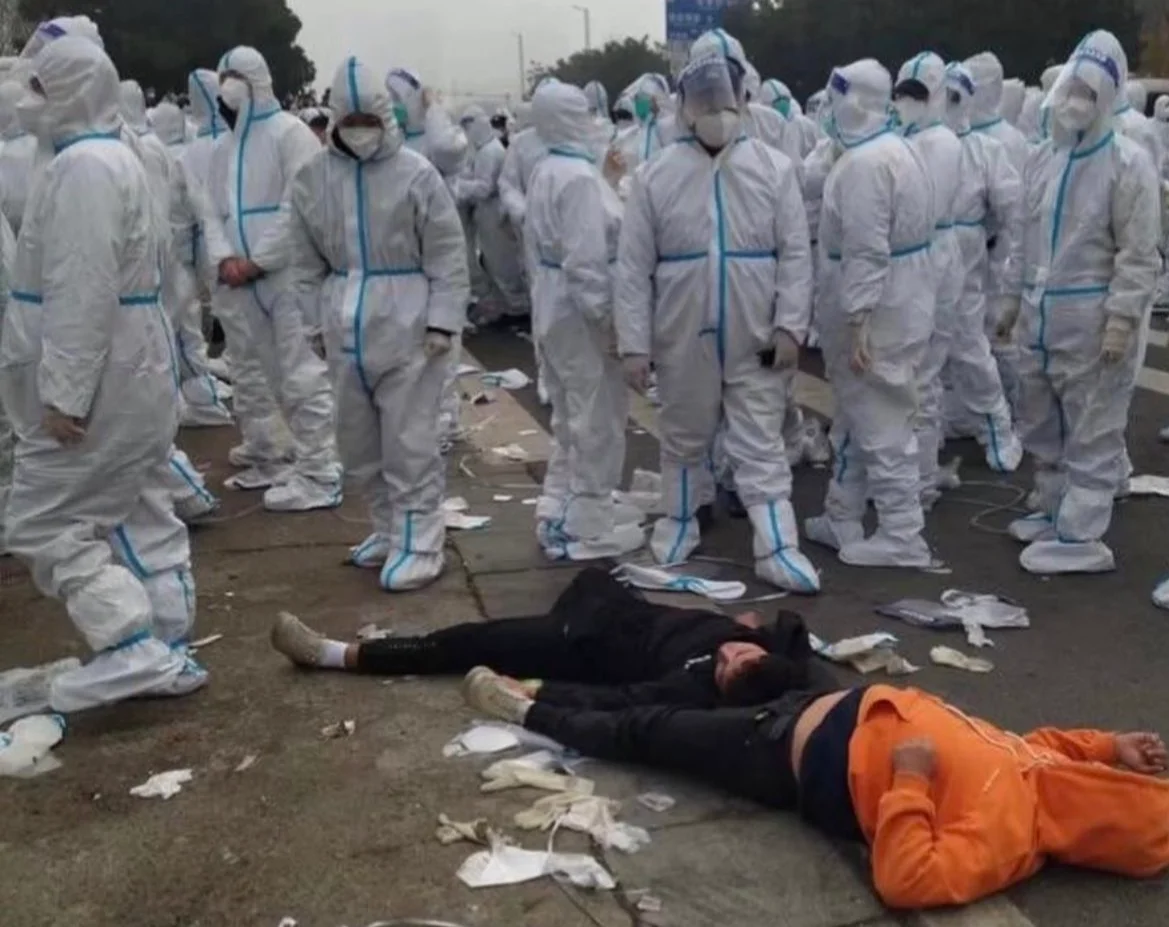 СМИ сообщили, что протестующие — работники самой крупной фабрики по производству iPhone в городе Чжэнчжоу в Китае, а люди в белом — силовики.