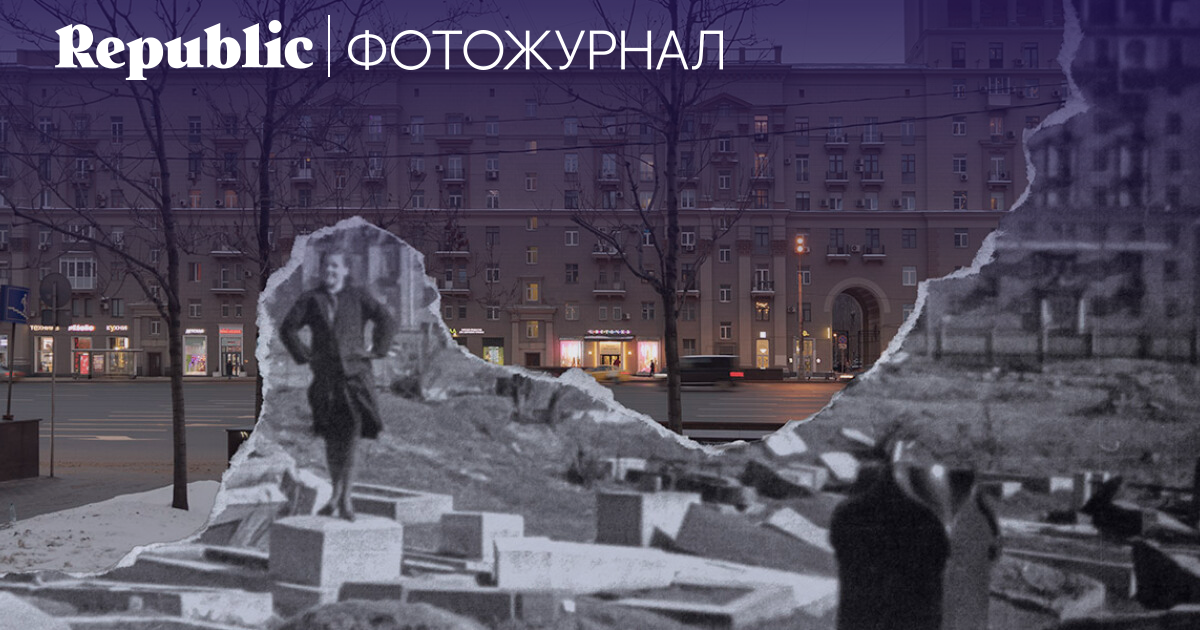 Фотоколлаж из позирующей на уничтожаемом Дорогомиловском кладбище девушки и современной территории на его месте