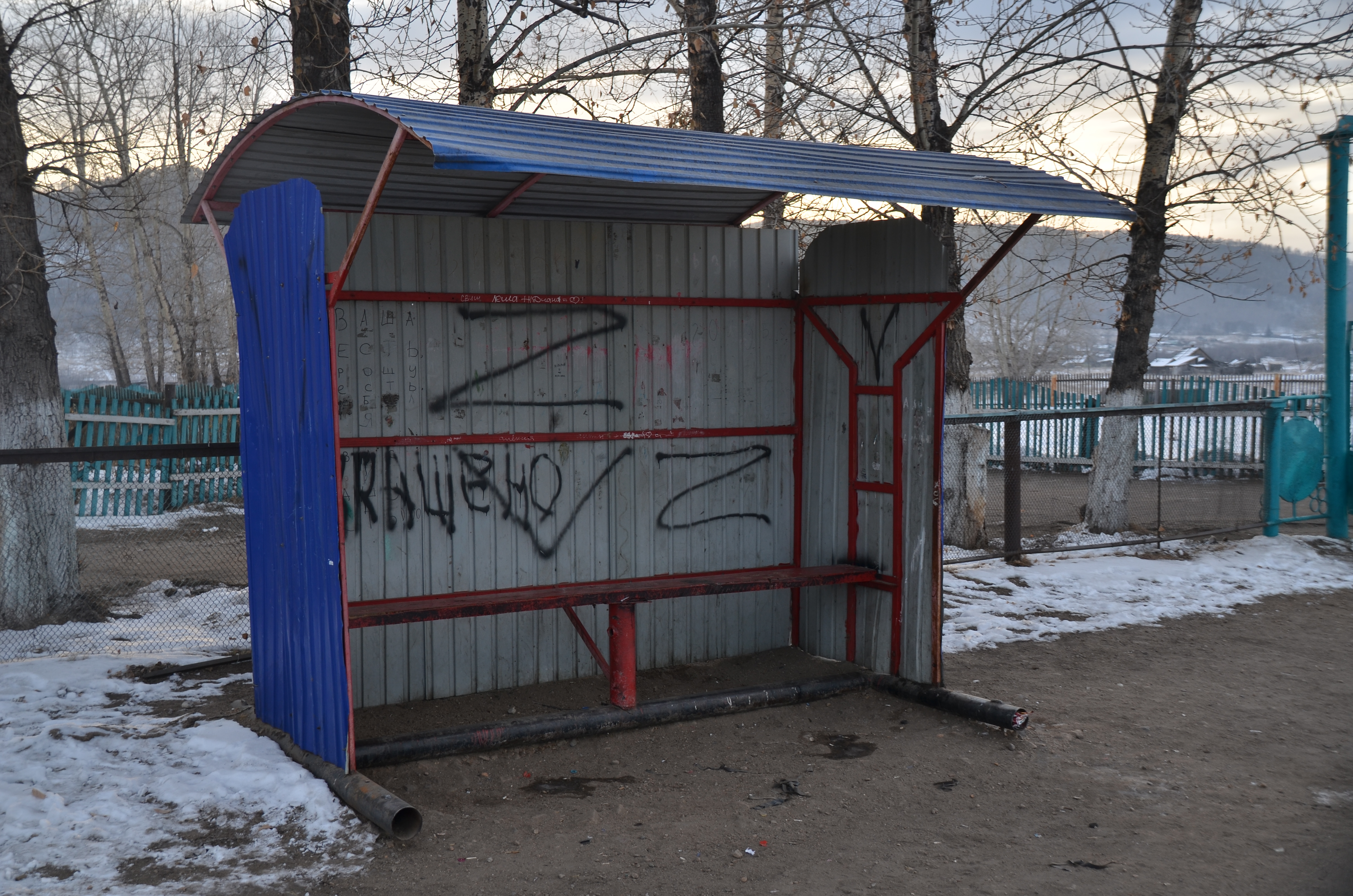 У средней школы №10 – остановка, разрисована буквами "Z" и "V".