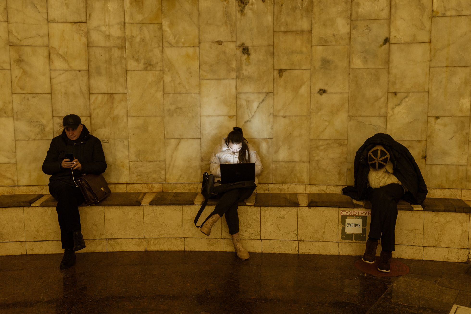 Многие жители города спускаются с ноутбуками работать в метро, так как там есть интернет. Около половины киевлян уже два дня остаются без света после очередных массированных атак по критической инфраструктуре.