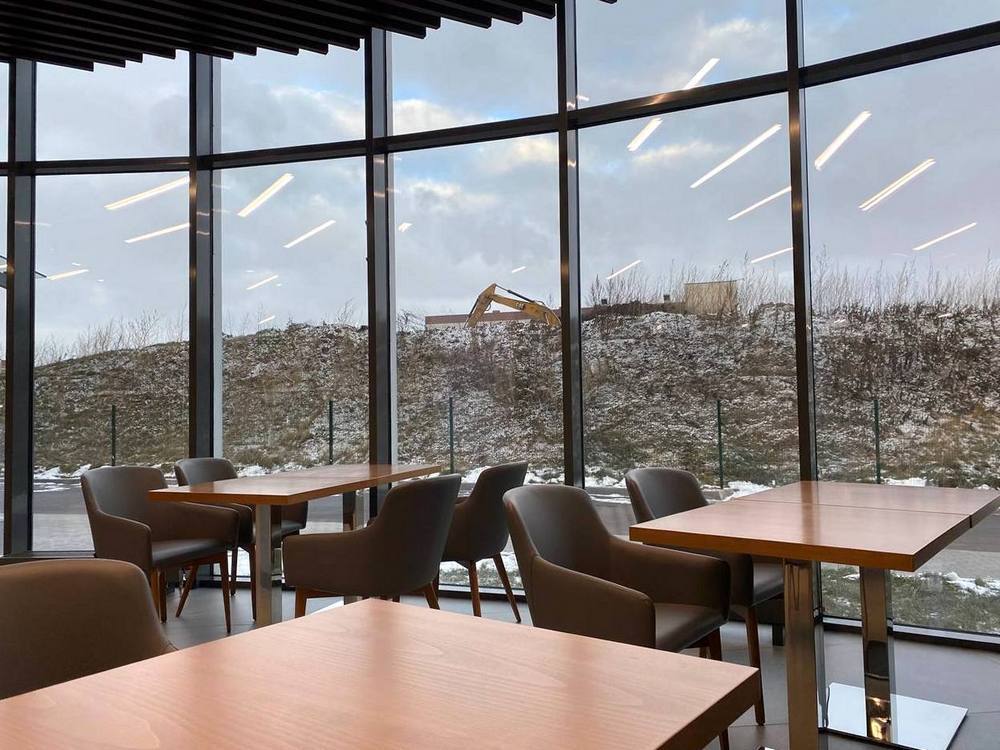 Сейчас территория центра ограждена забором, вход возможен через шлагбаумы. В четверг, 24 ноября, «Бумага» не обнаружила ни грузовика с буквой Z на кузове, который встречал гостей в день открытия, ни других людей. Не видно даже охраны. Лишь изредка из здания на перекур выходят рабочие — судя по одежде, они занимаются ремонтом верхних этажей.