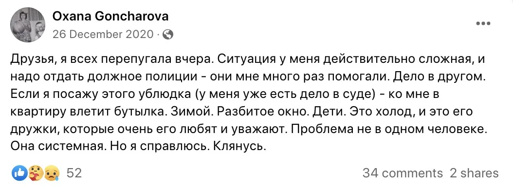 «В начале октября в беду попала талантливая журналистка «Ведомостей» и «РБК» Оксана Гончарова, с которой и мы, и многие из вас работали. На протяжении 15 лет Оксана была жертвой домашнего насилия. У нее нет ни одного целого ребра, сломан нос, неоднократно выбиты зубы. Она рассталась с гражданским супругом много лет назад, но он всё время приходил, избивал ее и проявлял агрессию к детям», — написала в фейсбуке Ольга Павликова, основательница PR-агентства TrendFox и подруга Оксаны.