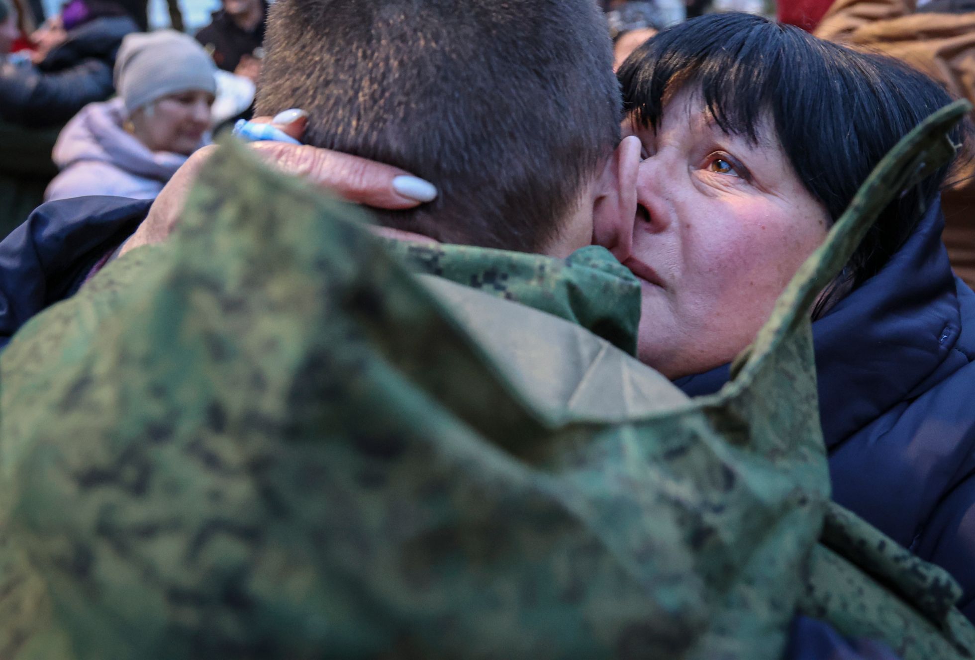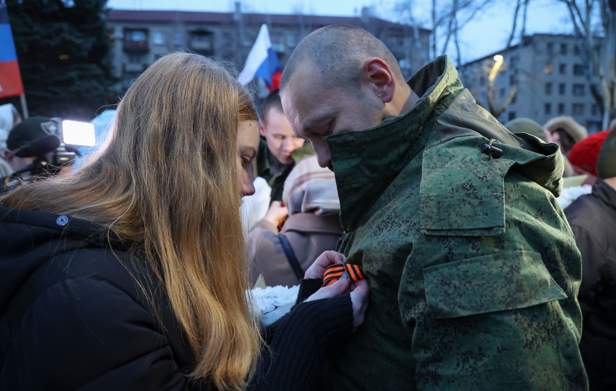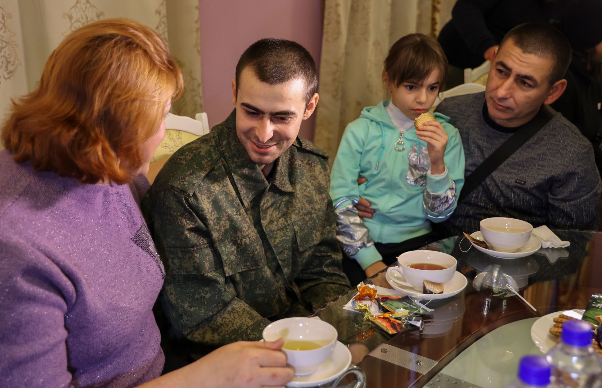 Alessandro Guerra / EPA / Scanpix / LETA Девушка из патриотической общественной организации «Молодая республика» в Харцызске Донецкой области прикалывает георгиевскую ленточку на форму военнослужащего «народной милиции» ДНР. Это один из солдат из аннексированного Россией региона, который вернулся из украинского плена в результате обмена с ВСУ 24 ноябряAlessandro Guerra / EPA / Scanpix / LETA Вернувшийся в результате обмена пленными с Украиной мобилизованный из ДНР дома с семьей Alessandro Guerra / EPA / Scanpix / LETA Мобилизованный из Харцызска (аннексированная Россией Донецкая область) встречается с матерью после обмена пленными с Украиной