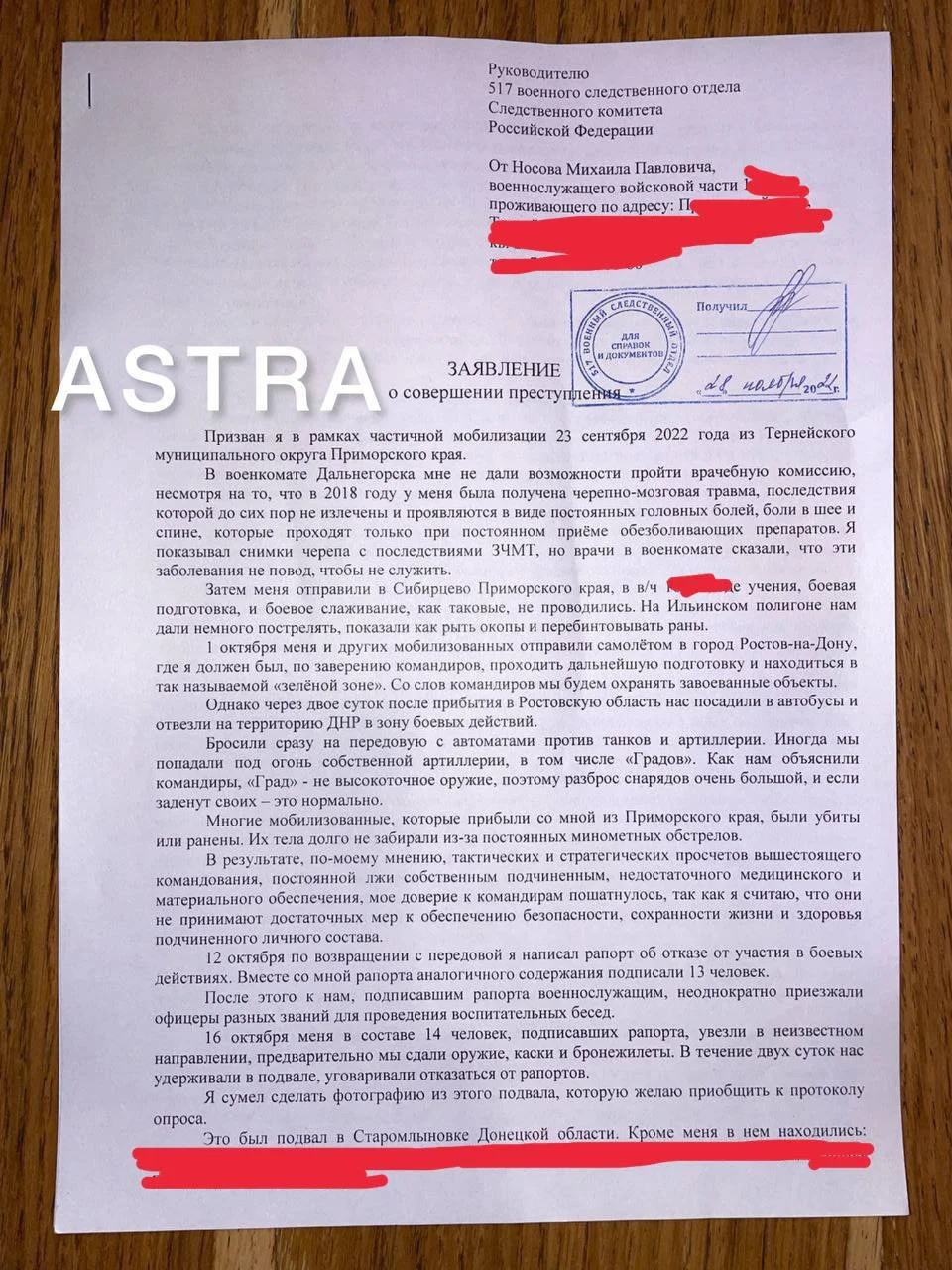 Михаила Носова призвали 23 сентября и отправили воевать «без проведения медкомиссии и должной боевой подготовки», пишет ASTRA. Он написал рапорт об отказе от участия в боевых действиях. За это его удерживали два дня в подвале в Старомлыновке, затем заставили рыть окопы в лесу, через две недели спросили, не передумал ли он, и, услышав отрицательный ответ, отправили в подвал в Завитне Бажання в «ДНР».
