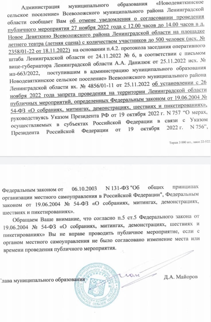 Власти согласовали митинг более чем за неделю до собрания. Однако 26 ноября — за день до демонстрации — администрация деревни отменила митинг, сославшись на письмо вице-губернатора Ленинградской области Анны Данилюк.