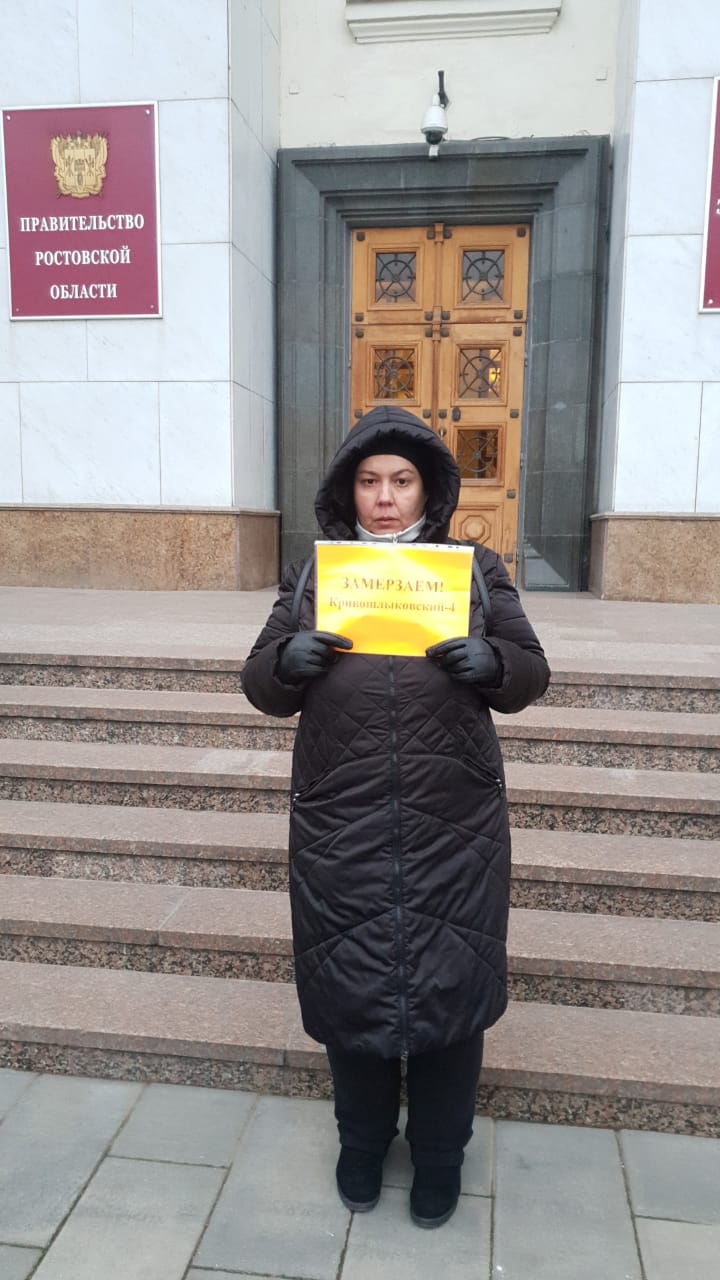 В Ростове-на-Дону жители отключенного от отопления аварийного дома провели 28 ноября серию одиночных пикетов у правительства области, они вышли с плакатами "Спасите" и "Замерзаем".