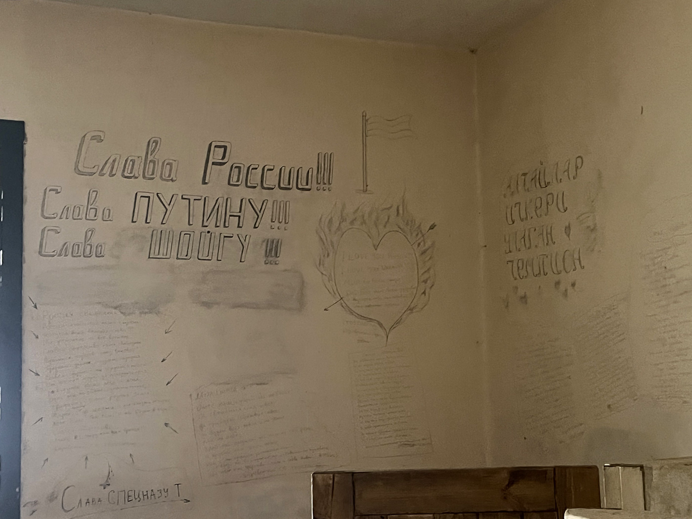 “Praise Russia!!! Praise Putin!!! Praise Shoigu!!!” on the wall of one torture chamber. Photo: Petr Ruzavin / Mediazona