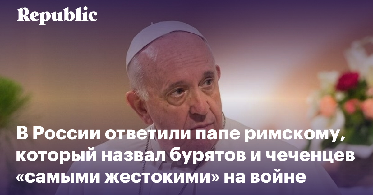 Папа римский Франциск в интервью американскому христианскому журналу America назвал чеченцев и бурятов «самыми жестокими» представителями российских войск на войне в Украине. На резонансное заявление понтифика поспешили отреагировать в России. Так, в МИД РФ сказали, что это «уже не русофобия, а извращение». Другие реакции российских властей — в подборке Republic.
