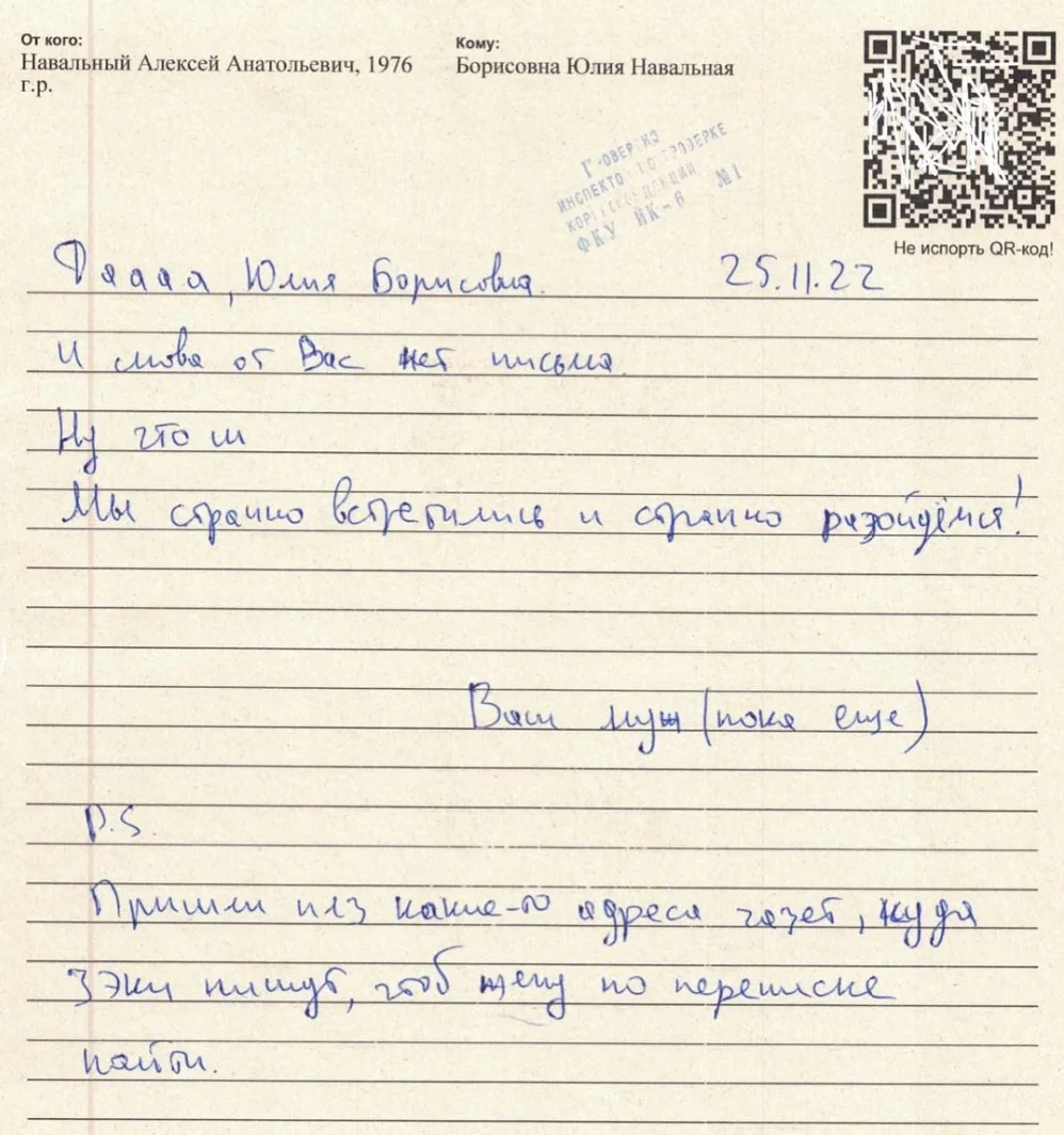 Жена политика опубликовала письмо от Алексея, датированное 25 ноября. В нем сказано: «Даааа, Юлия Борисовна. И снова от Вас нет письма. Ну что ш. Мы странно встретились и странно разойдемся! Ваш муж (пока еще). P.S. Пришли плз какие-то адреса газет, куда зэки пишут, чтоб жену по переписке найти».