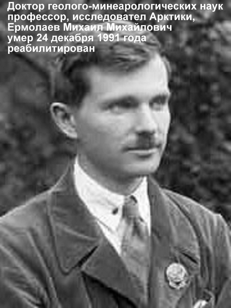 Один из первых арктических морских геологов Михаил Ермолаев был арестован 5 июня 1938 года. При обыске у него изъяли и уничтожили готовую докторскую диссертацию «Оледенение Новой Земли». Через год освободили, но вскоре вновь арестовали, предъявив обвинения – «шпионаж», «связь с врагами народа и иностранцами», «вредительский отрыв народных средств на бесплодное изучение морского дна» и осудили на 10 лет лагерей. Работая на строительстве Воркутинской железной дороги, предложил новый метод укладки шпал на вечную мерзлоту, за что срок заключения ему был сокращен на 2 года.