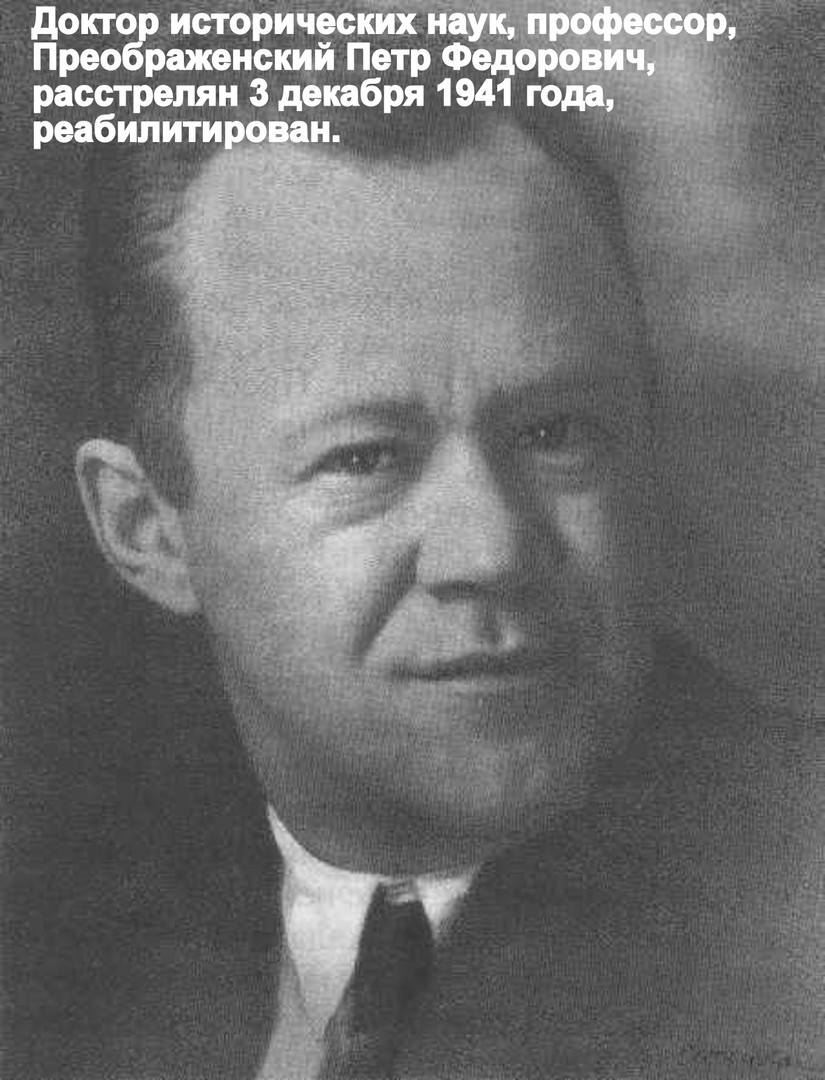 Автор трудов по истории Древней Греции и Рима, этнологии и истории международных отношений Петр Преображенский в первый раз был арестован 4 января 1933 года по обвинению в создании «антисововетской группы научных работников» и приговорен к 3 годам ссылки в Северный край условно. 14 апреля 1937 года его арестовали вторично «за проведение контрреволюционной деятельности» и приговорили к 8 годам лагерей. Наказание отбывал в Ухтижемлаге, прямо там он был арестован в третий раз и 14 октября 1941 года приговорен к расстрелу.