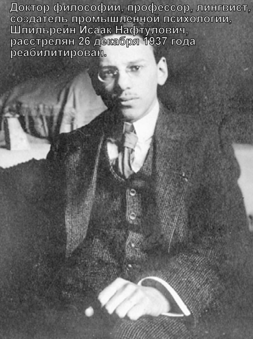 Психолог, специалист в области научной организации труда и психотехники Исаак Шпильрейн был арестован 26 января 1935 года. Формальным поводом послужила опубликованная в 1928 году книга «Язык красноармейца: опыт исследования словаря красноармейца Московского гарнизона». По обвинению в контрреволюционной пропаганде и троцкизме его осудили на 5 лет лагерей. Сначала он оказался в населенном пункте Покча-Судострой Автономной области Коми, позже его перевели в Ухтпечлаг, а затем – в Карлаг. В феврале 1936 года он подал заявление о возможности создания при санаторном городе Печорского отделения Ухтпечлага психологического кабинета, но оно было отклонено. Во время пребывания в Карлаге Исаака Нафтуловича повторно арестовала и обвинили в «ведении шпионской деятельности и террористической работы в пользу германской разведки». 26 декабря 1937 года Военная коллегия Верховного суда СССР приговорила Исаака Шпильрейна к расстрелу.