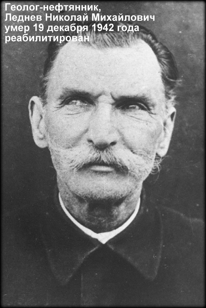 Геолога Николая Леднёва арестовали в марте 1929 по «делу Геолкома» за якобы участие в контрреволюционной и шпионской деятельности и осудили на десять лет лагерей. Поначалу отбывал наказание в поселке Чибью, но через год за успехи в работе пребывание в лагере заменили ссылкой, где на протяжении 10 лет он занимался поисками и разведкой нефти и газа в бассейне Средней Печоры. В 1940 году получил назначение в Ухту на должность старшего геолога Ухтижемлага, преподавал в Ухтинском горном техникуме. 20 июня 1941 года был условно освобожден и переведен на положение колонизованного, а 2 августа оправдан и полностью освобожден из-под стражи. Прожил на свободе чуть больше года. Похоронен в Ухте.
