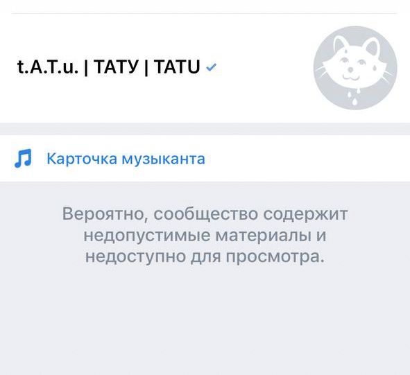 Паблик группы «Тату» в ВК ввел возрастные ограничения из-за запрета «пропаганды» ЛГБТ. И перестал отображаться у части пользователей