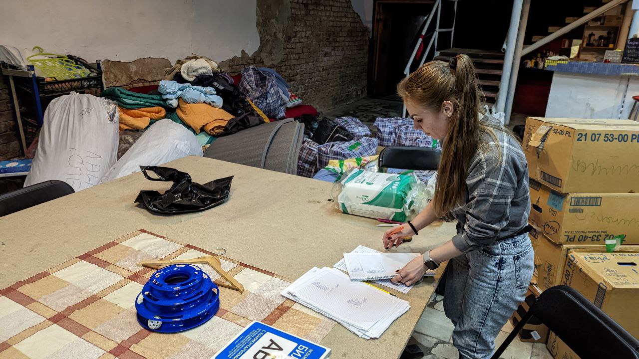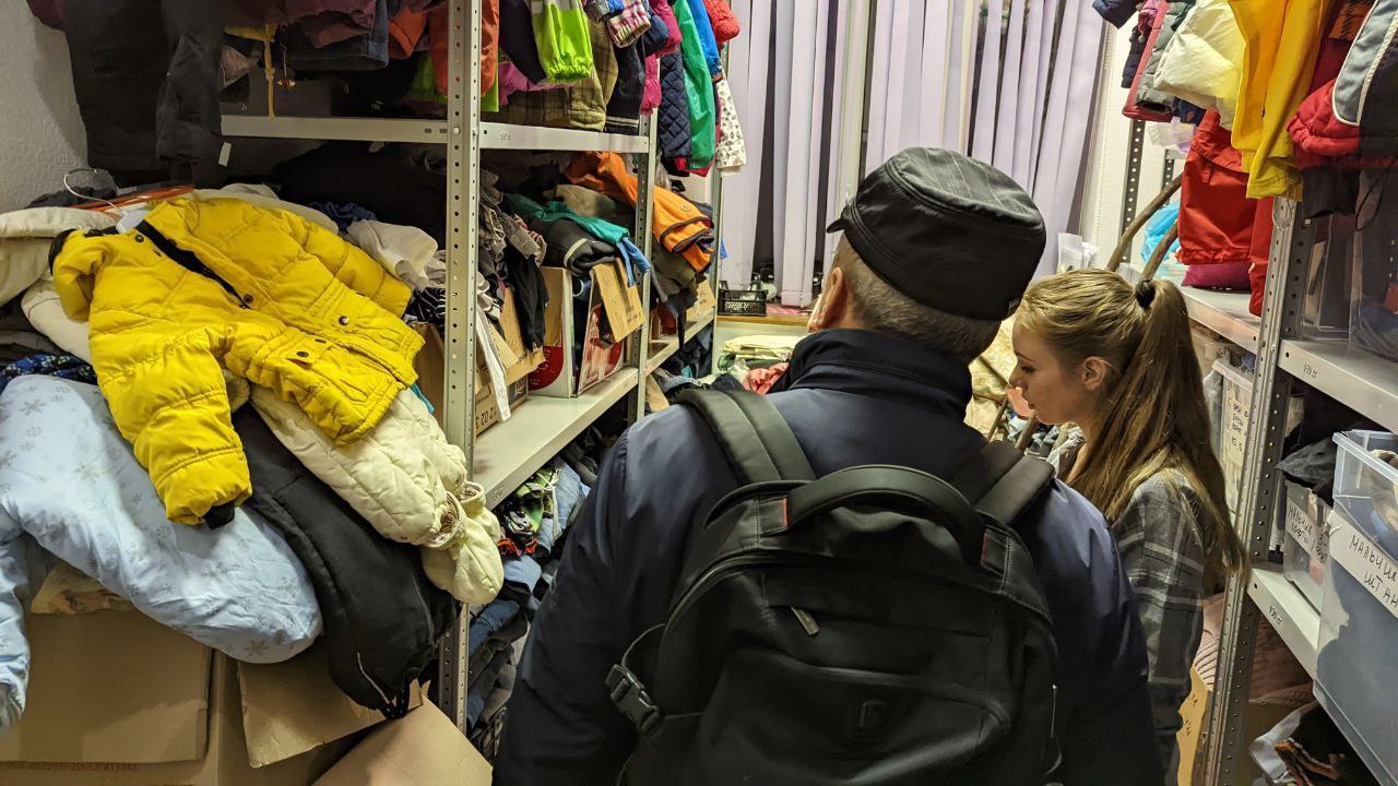 Волонтеры рассказали Лене про открывшийся Гумсклад – что там нужен человек, который бы принимал от горожан и выдавал вещи беженцам. Так Лена нашла работу. Работает практически ежедневно, а люди на Гумсклад из Украины идут сплошным потоком – всем им нужны теплые вещи, обувь, посуда, постельное белье, кастрюли и сковородки.