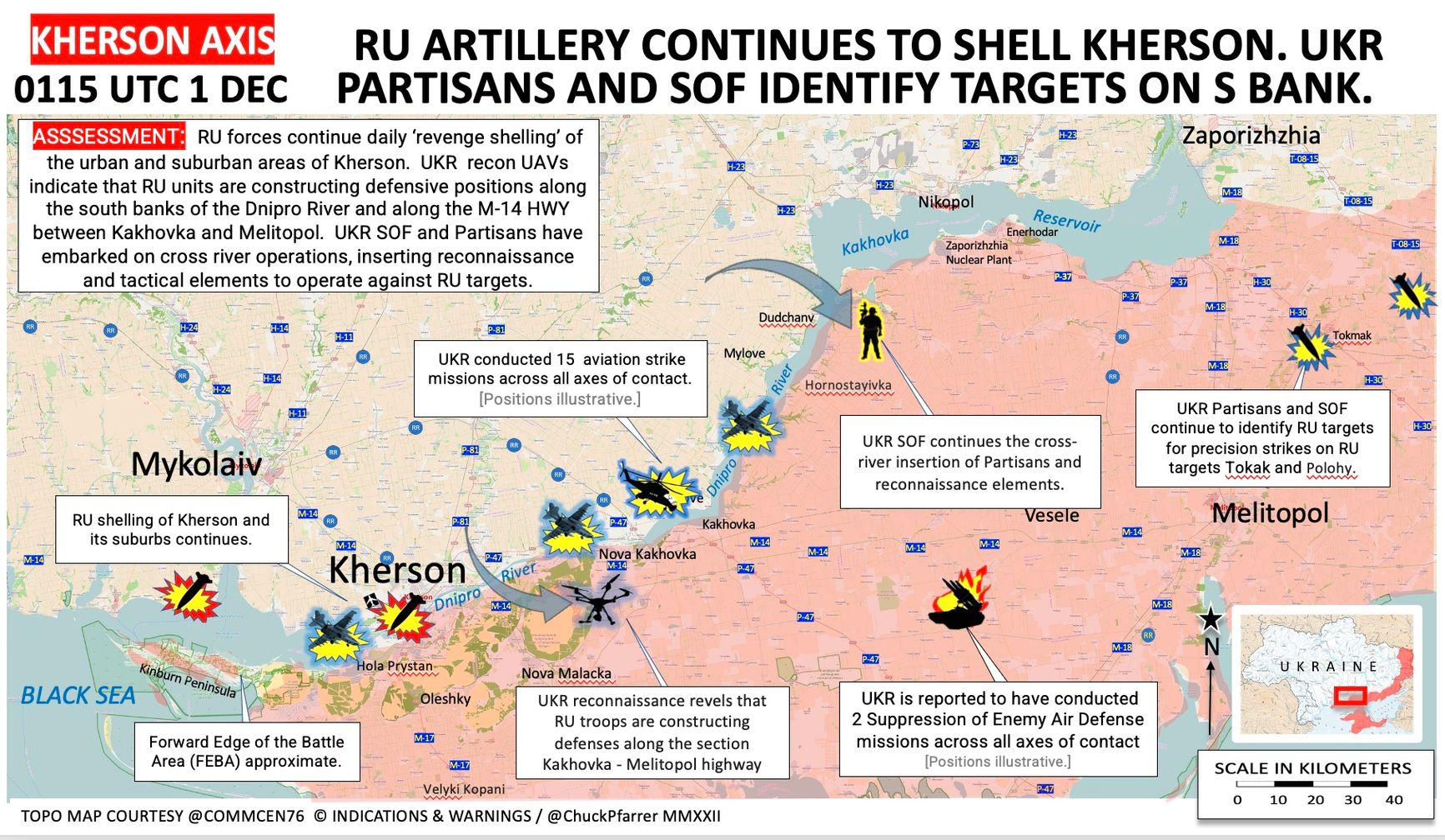 Российские военные продолжают ежедневные обстрелы Херсона и пригородных районов. Украинские разведывательные БПЛА показывают, что российские подразделения строят оборонительные позиции вдоль левого берега Днепра и шоссе М-14, пишет в Twitter военный корреспондент, бывший военнослужащий «Морских котиков» США Чак Пфаррер.