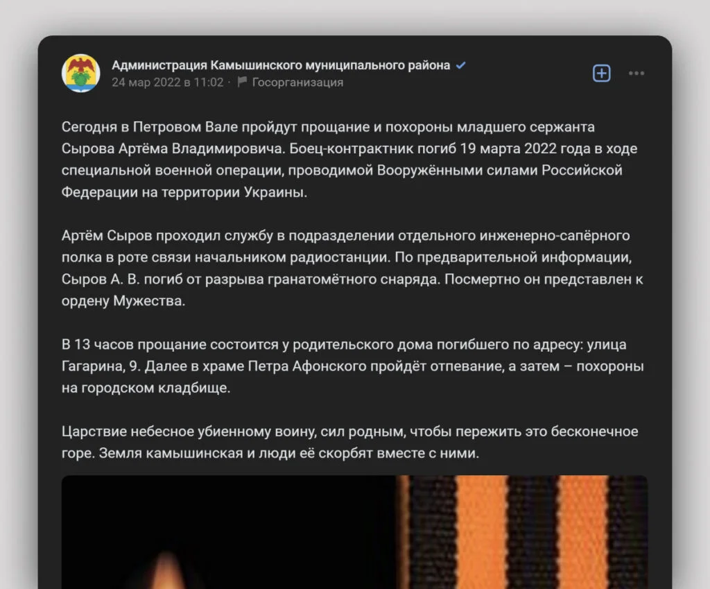 31-летний Артём — сын Любови и Владимира Сыровых — погиб в марте. Он был профессиональным военным, начальником радиостанции подразделения отдельного инженерно-сапёрного полка. Его похоронили на родине — в посёлке Петров Вал Волгоградской области — через несколько дней после смерти.