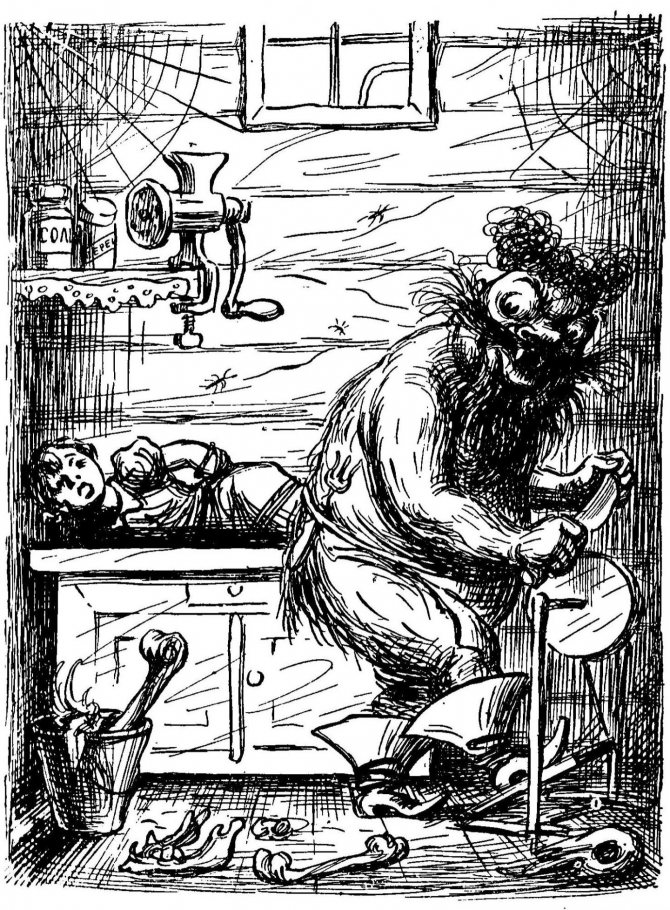 «Мясорубка угрожающе поджидает на полке прямо над связанной Элли, которая лежит на столе, пока свирепый пучеглазый зубастый Людоед с торчащими черными волосами и усами, похожими на звериные, точит в углу нож на точильном станке. Рисунок вызывает такой ужас, какой ребенку не забыть до старости».