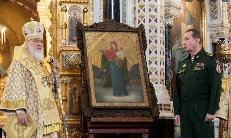 В марте после очередной службы в храме Христа Спасителя патриарх Кирилл вручил главе Росгвардии генералу Виктору Золотову икону, чтобы "этот образ вдохновил молодых воинов" в Украине. Золотов в ответ заверил прихожан и патриарха, что "войска национальной гвардии выполнят все поставленные задачи" в Украине, а "икона будет защищать русское воинство и ускорит нашу победу".