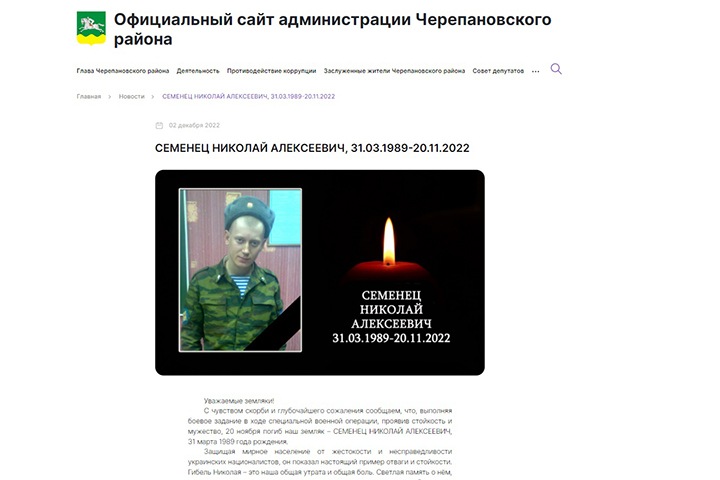 33-летний Николай Семенец погиб при «спецоперации». Об этом сообщила администрация Черепановского района, выразив соболезнования. Но некролог позже был удален с сайта. Он сохранился в кэше.