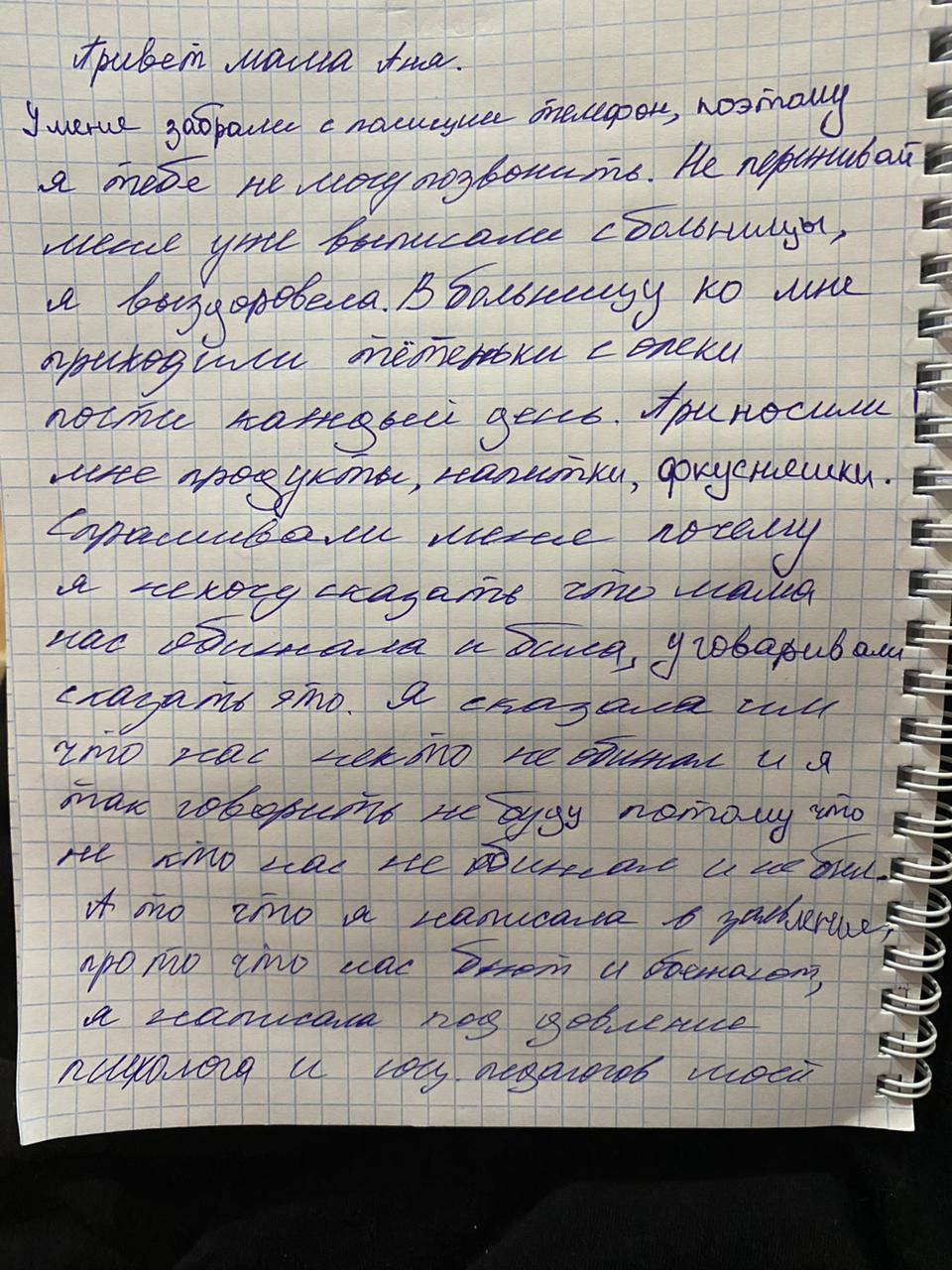 По словам Анны, девочка написала три заявления – первое о том, что Анна бьет только ее, второе – что бьет всех детей, а третье – что не бьет никого. Это заявление она писала уже у следователя, которому рассказала, что просто обиделась на маму, которая ее отругала и отобрала телефон с ноутбуком.
