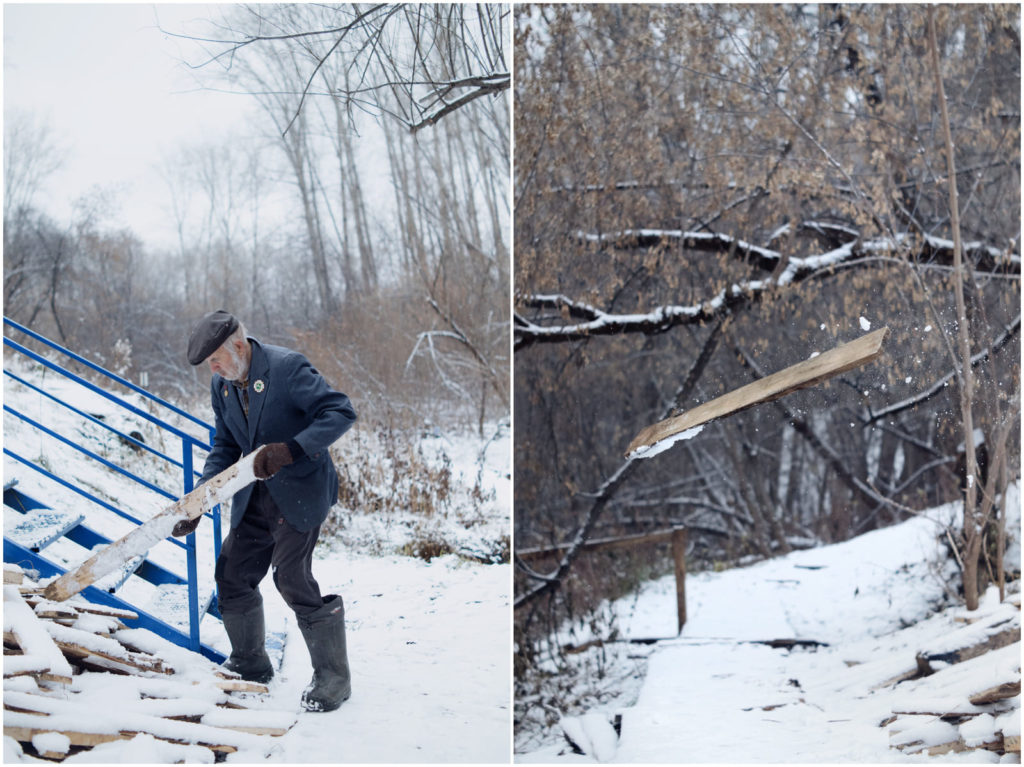 Родники, которых в Михайловской роще около пятидесяти, пенсионер-гидрогеолог раньше изучал, а теперь обустраивает в любое время года. Старается приходить каждый день и работает, «пока не упадёт». Упасть на мокрой, скользкой земле легче лёгкого и безо всякой работы. В месте, где деревянный тротуар стоит под уклоном, Александр заваливается назад. Нога в резиновом сапоге слетает в грязь.