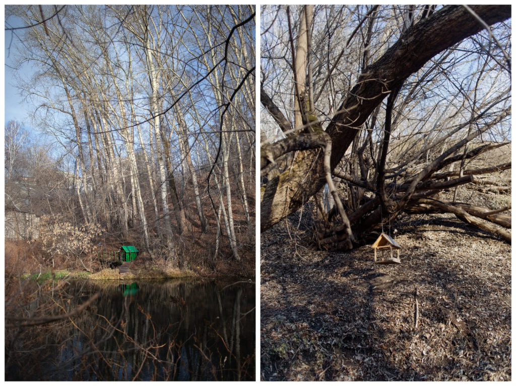 Олеся сидит на деревянной лавке у дерева возле Университетского озера рядом с одним из корпусов Томского государственного университета. Несколько лет назад лавку сколотил Назаров, а в этом году волонтёры сделали на том же месте новую взамен обветшавшей. В чаше прудика «Философ» в паре шагов плавают разноцветные осенние листья. Родник, что питает пруд, журча, течёт в Университетское озеро, туда же бегут водопадиками родники «Алексей», «Святая Анна» и «Алёна». Хотя Московский тракт — оживлённая улица, в 50 метрах за озером, ручьи и птицы тут слышнее, чем машины.