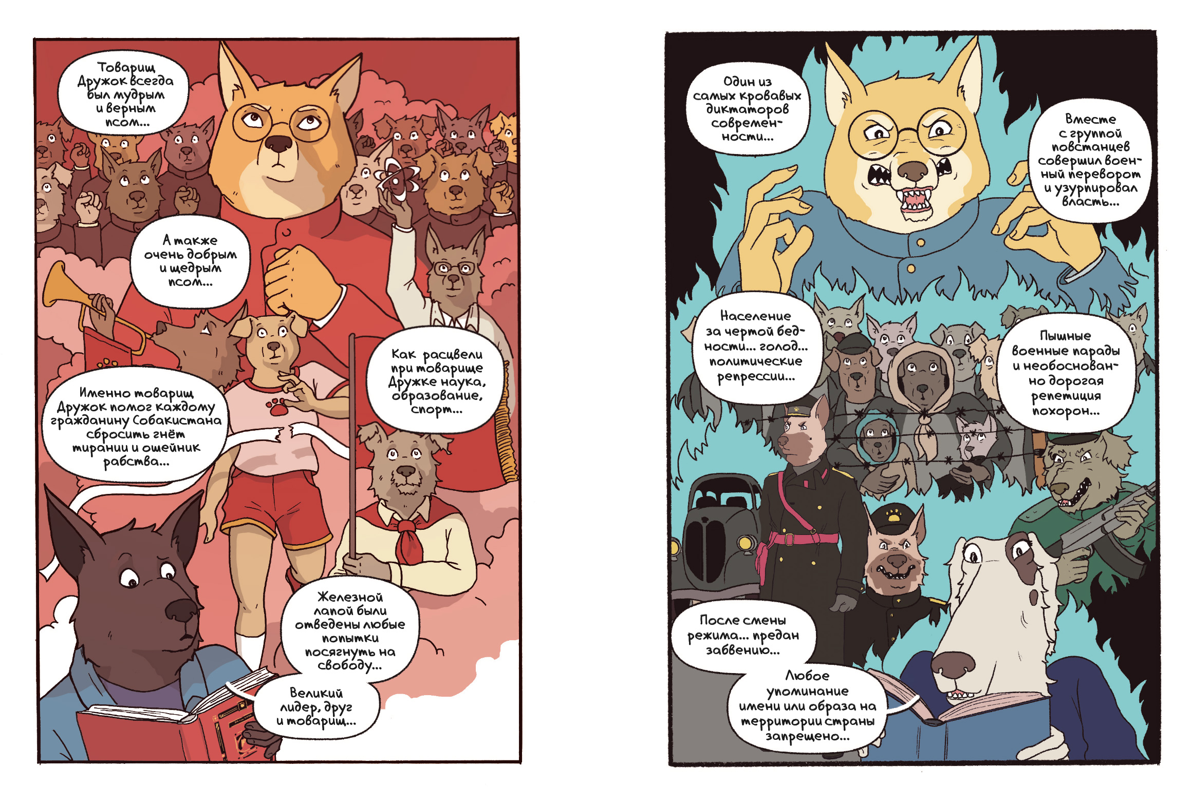 Истинную суть нового режима мы понимаем, когда переносимся в суд, рассматривающий дело Кометы — гипнощенка из первой части, к третьему тому ставшего пожилой собакой. Ее обвиняют в осквернении памятника товарищу Дружку, который все эти годы и десятилетия, оказывается, так и стоял на том же самом месте, где его поставили во времена диктатуры. Постепенно мы узнаем, что собакистанское общество пришло к подобию консенсуса: товарищ Дружок был кровавым диктатором, но это наш кровавый диктатор, наше прошлое, которое нельзя ворошить, а тем более «оскорблять».