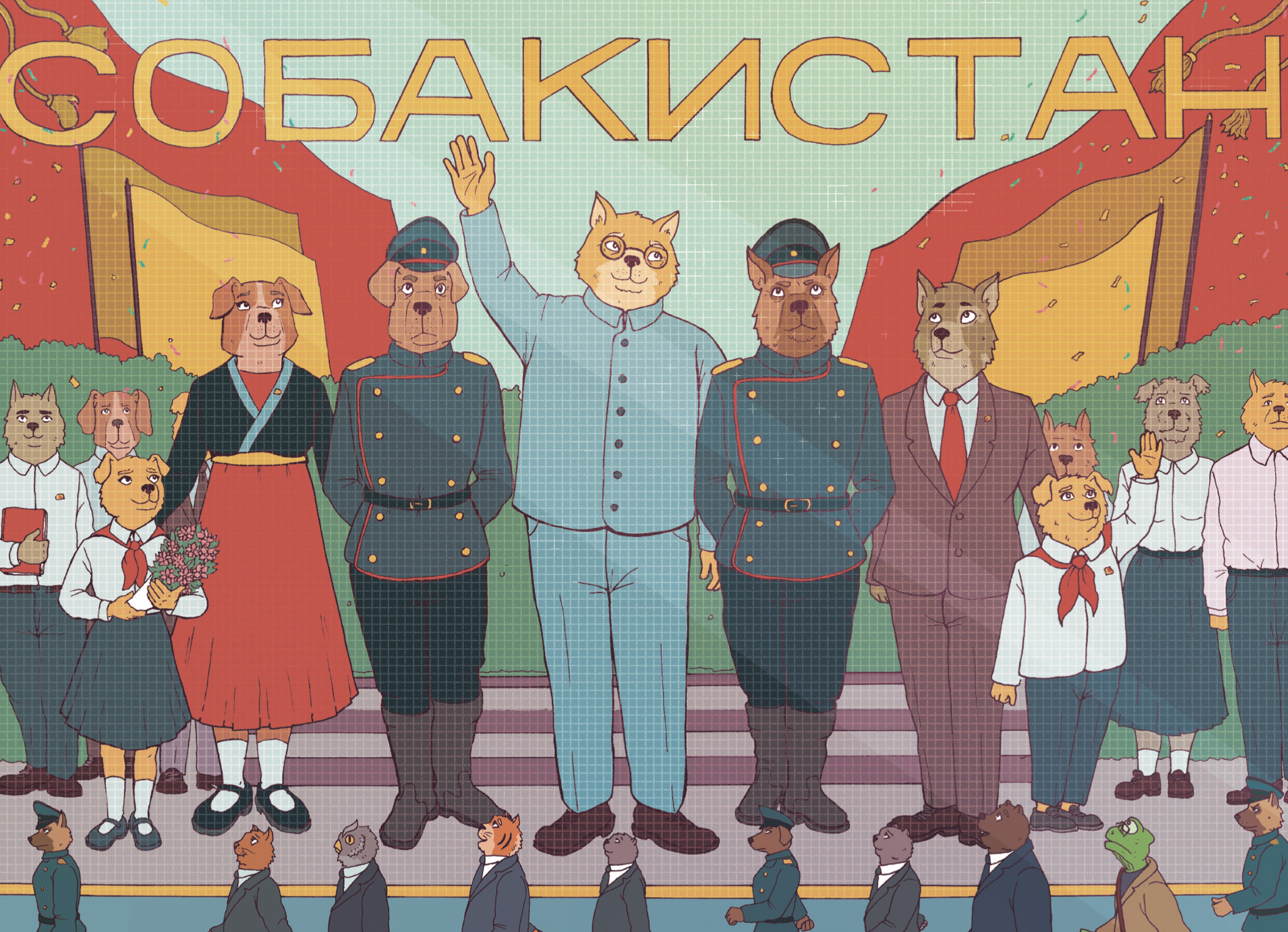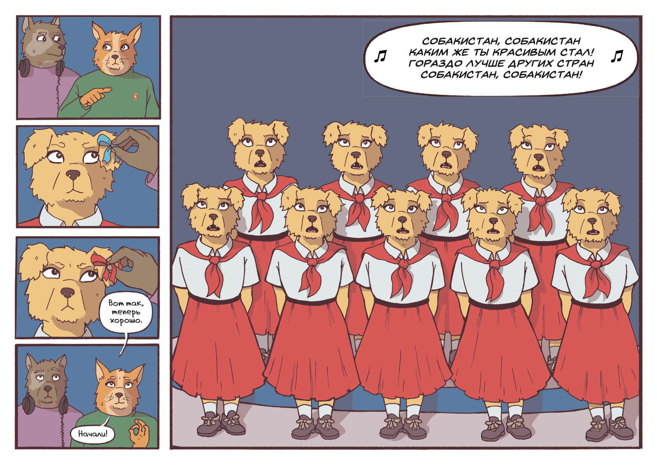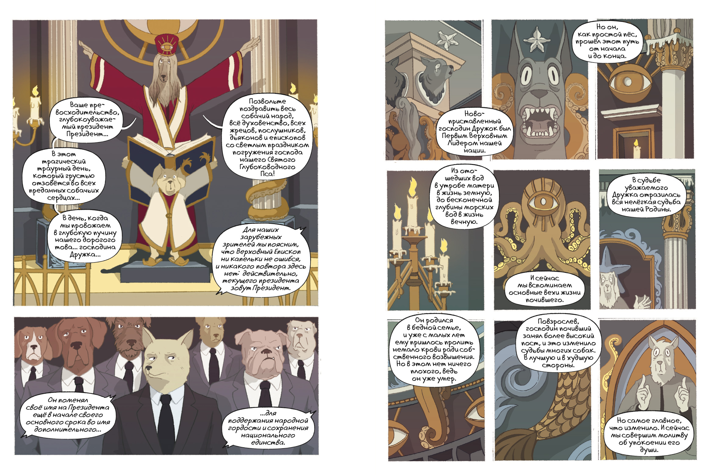 И вот здесь происходит удивительная вещь из тех, что составляют суть визуально-нарративного искусства. Когда речь заходит о «далеком прошлом», мы видим хронику отпевания (оказывается, в Собакистане все это время была религия) и похорон товарища Дружка. Пусть авторитарный кумач знамен все равно отдает холодом, это кажется более жизнелюбивой формой существования, чем стекляшки торговых центров с частным судом в одном из павильонов. Но, разумеется, это обман, ловушка, в которую, по всей видимости, угодили обитатели Собакистана на пути от диктатуры к демократии. Внимательный же читатель заметит, что храм, в котором отпевают Дружка, явно установлен в честь некоего подводного существа — возможно, дремлющего в Р’льехе.