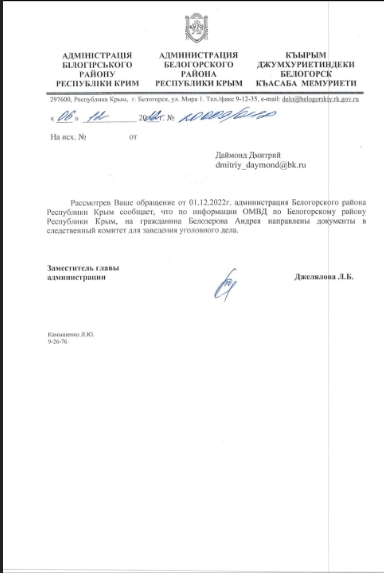 По информации Андрея Белозерова, человек, написавший на него жалобу, сам прислал ему ответ российской администрации Белогорского района, сопроводив его угрозами дальнейшей расправы.
