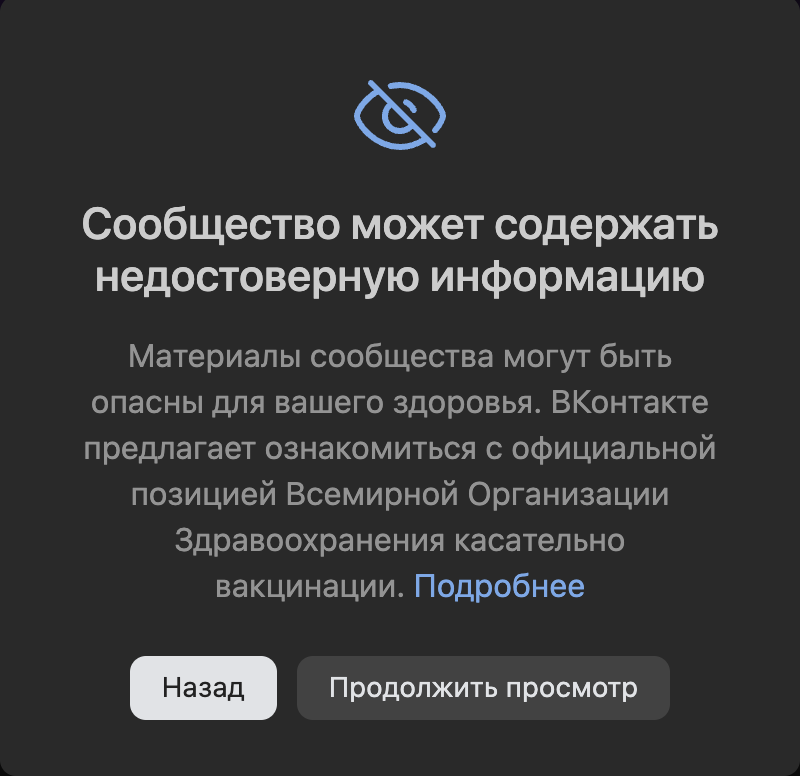 «Сообщество может содержать недостоверную информацию. Материалы сообщества могут быть опасны для вашего здоровья. ВКонтакте предлагает ознакомиться с официальной позицией Всемирной Организации Здравоохранения касательно вакцинации», — написано на плашке.