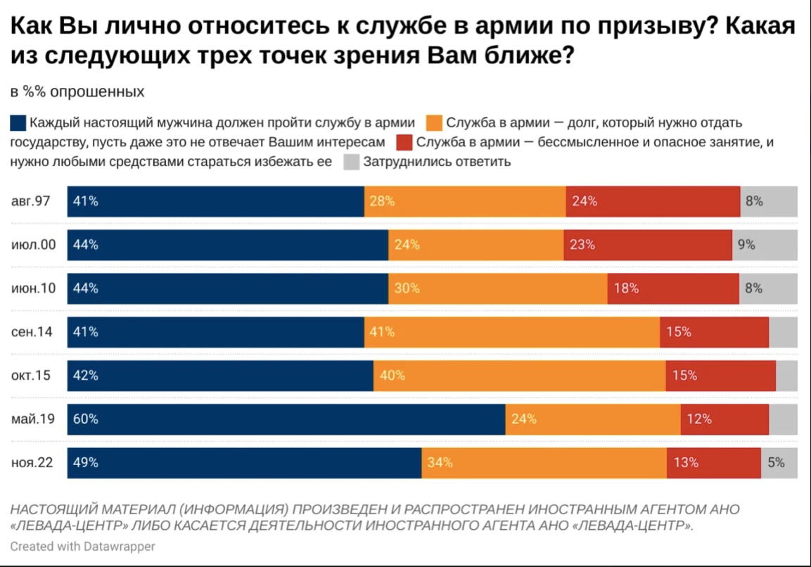 При этом, за три года процент придерживающихся такого мнения снизился с 60% до 49%. Однако с 24% до 34% увеличилась доля тех, кто рассматривает службу в армии как долг, который нужно отдать государству, несмотря на персональные интересы. 13% полагают, что служба в армии — бессмысленное и опасное занятие, которое нужно стараться избежать.